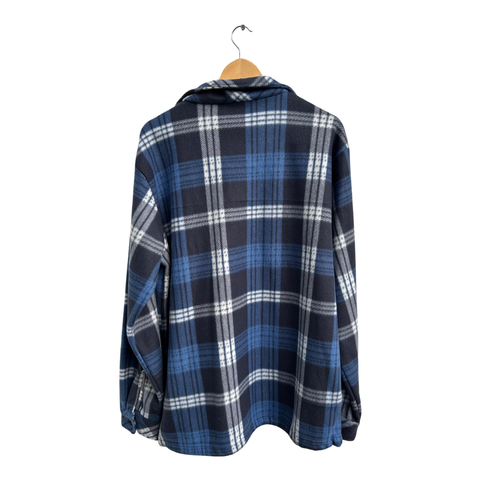 Gemütliche Holzfäller-Fleecejacke in Größe XL (entspricht etwa 56). Das Hemd ist superweich, warm und angenehm flauschig – perfekt für kalte Tage oder als leichte Jacke im Alltag. Es hat eine Brusttasche, einen Reißverschluss vorne und überzeugt durch sein klassisches blau-grau kariertes Muster. Ideal zum Überziehen über Shirts oder Pullover.