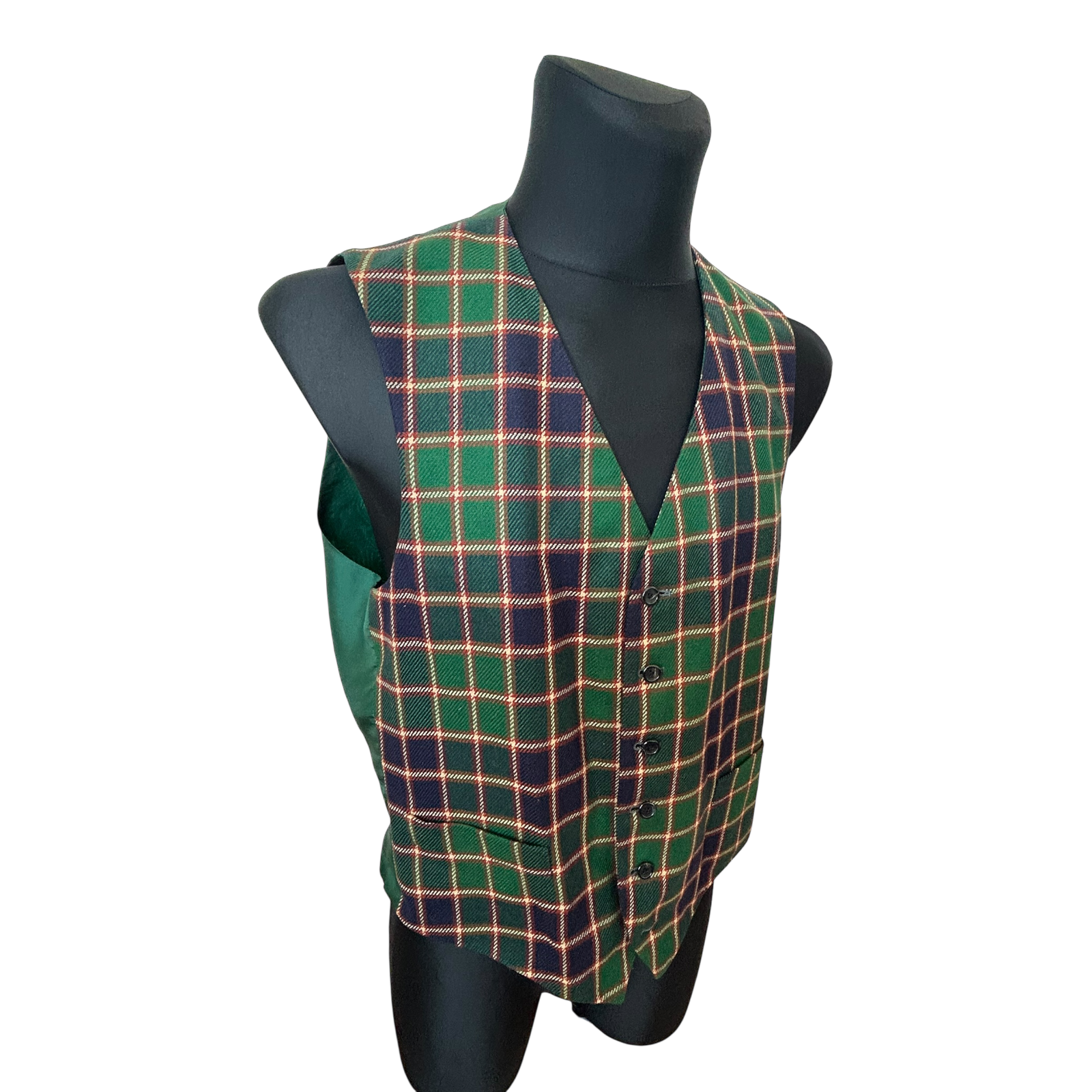 Charakterstarke Herrenweste im klassischen britischen Country-Stil mit markantem Karomuster in Grün, Dunkelblau und feinen roten Linien. Das Design erinnert an traditionelle Tweed- und Jagdwesten und verleiht jedem Outfit eine stilvolle, selbstbewusste Ausstrahlung 🍀