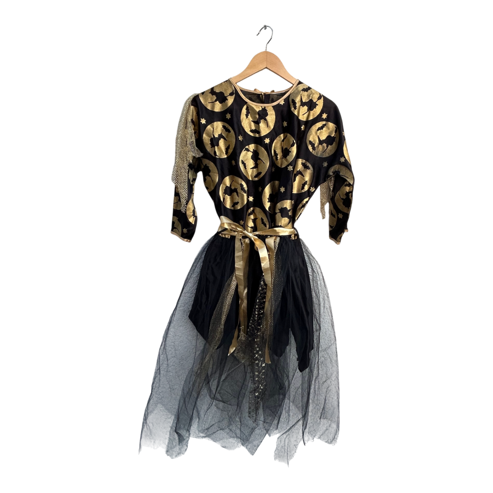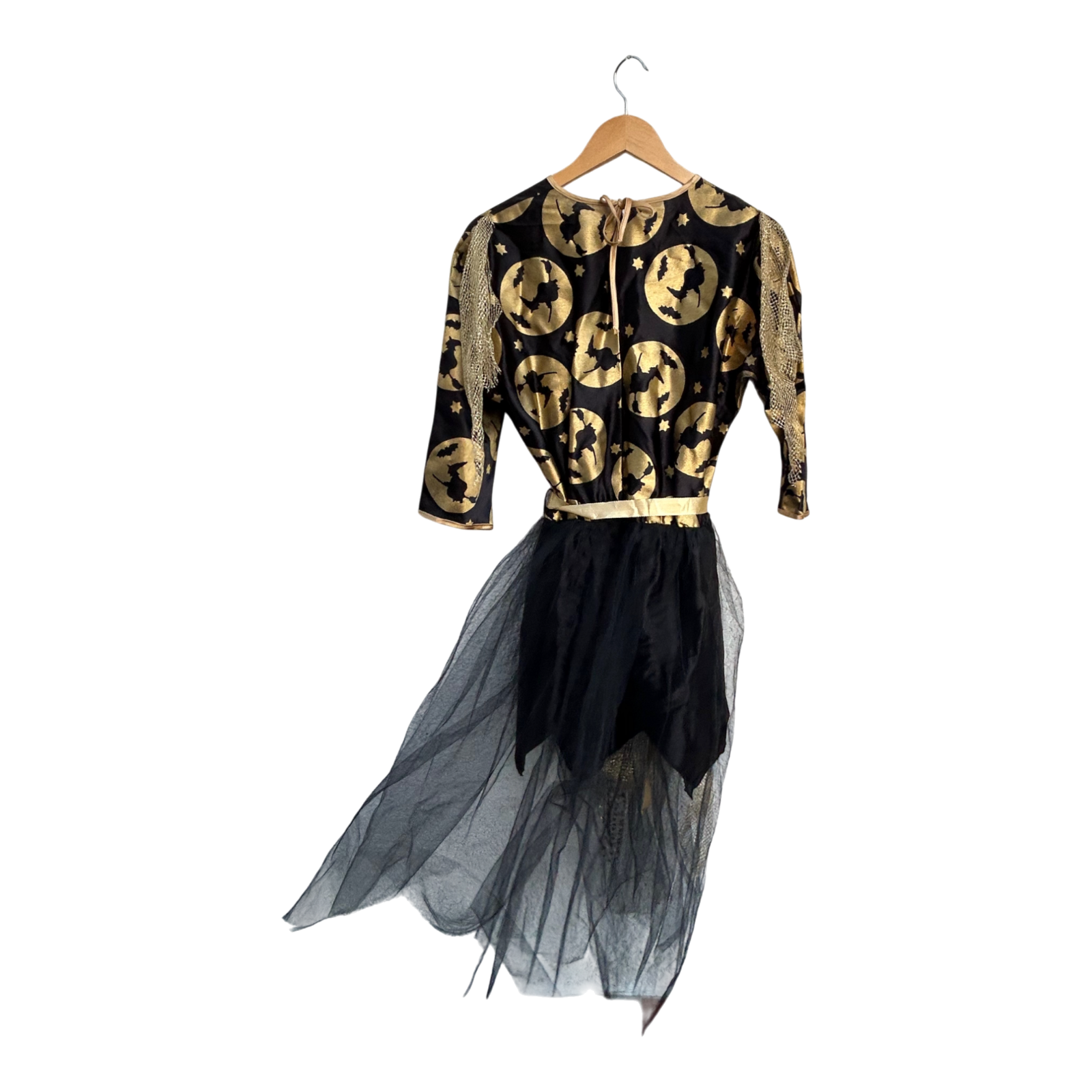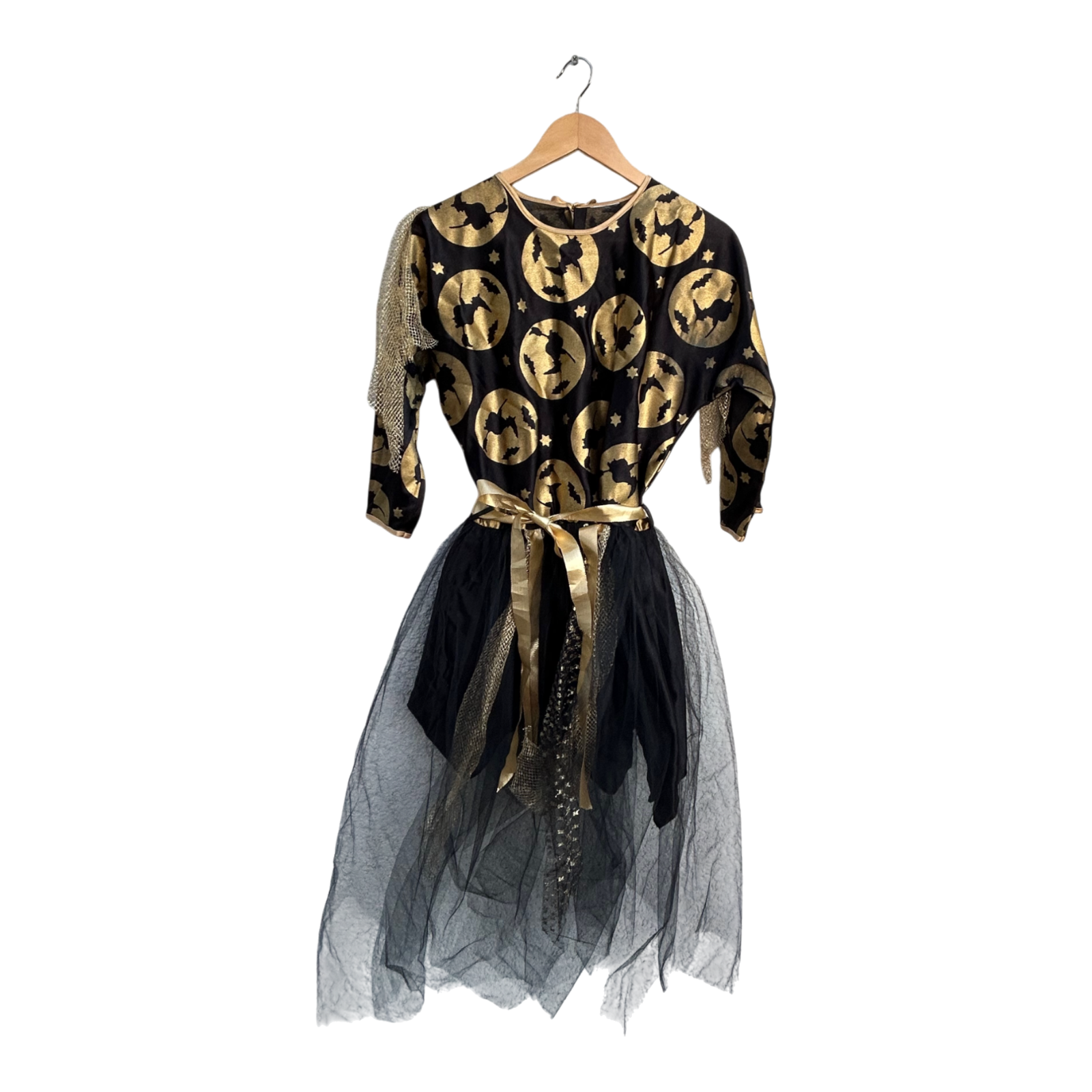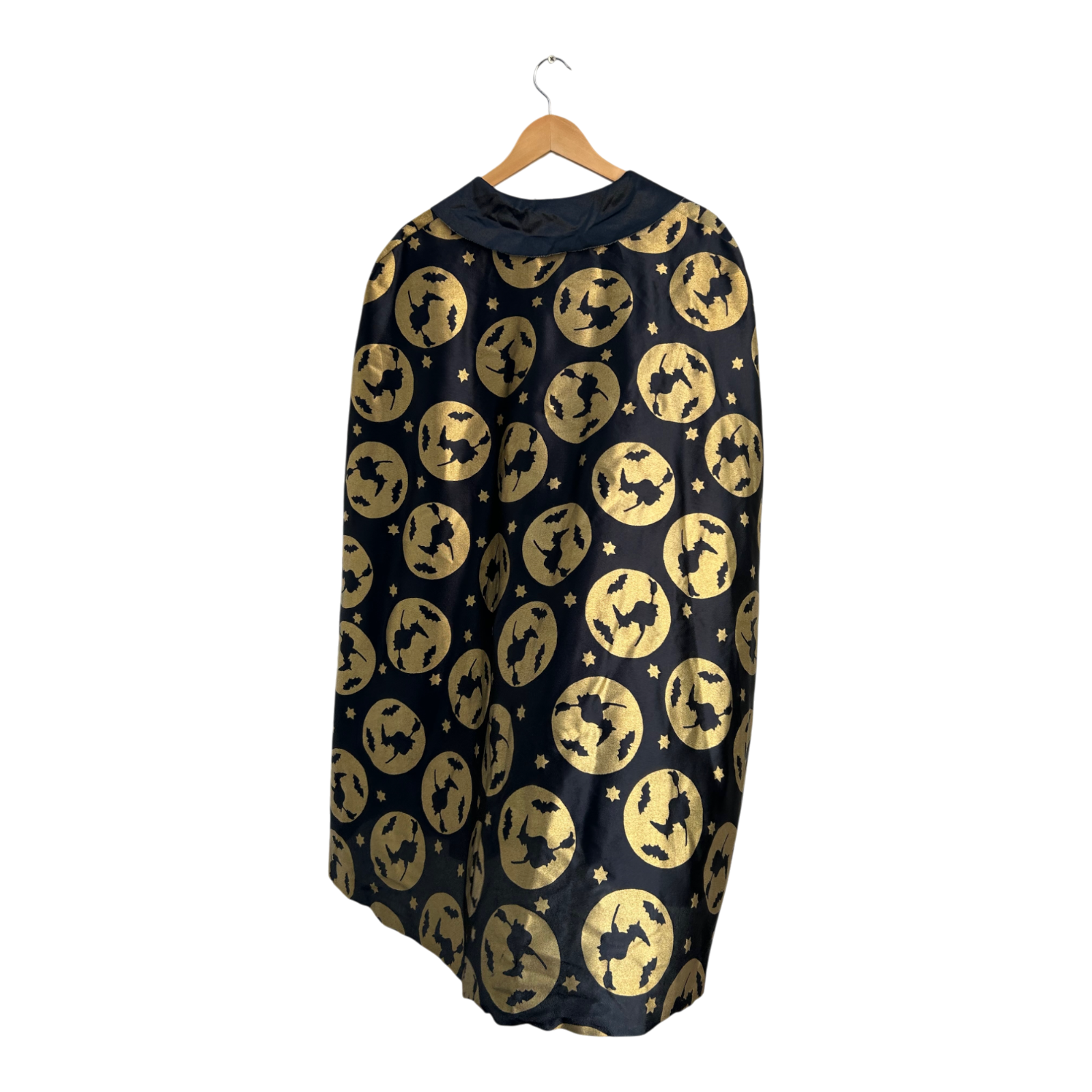 Dieses auffällige 2-teilige Damenkostüm besteht aus einem Kleid und einem passenden Umhang. Das Set ist aus Polyester gefertigt und kommt ohne Etikett. Das Kleid hat eine Brustweite von ca. 48 cm, 3/4 lange Ärmel und eine Gesamtlänge von etwa 120 cm. Der schwarze Stoff ist mit goldfarbenen Hexen- und Mondmotiven verziert und sorgt für einen glänzenden, magischen Auftritt. Ideal für Halloween, Karneval, Mottopartys oder Theateraufführungen. Der Umhang ist leicht, bequem zu tragen und verleiht dem Kostüm zusätzlichen Effekt. 🎃✨