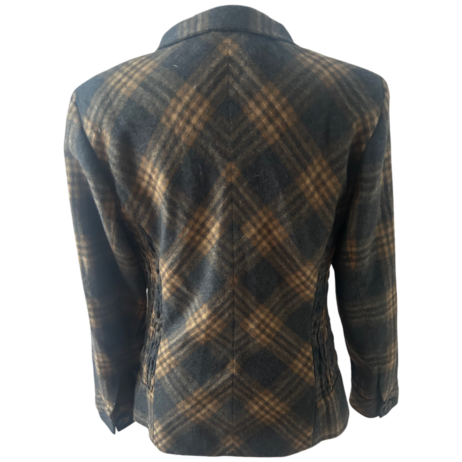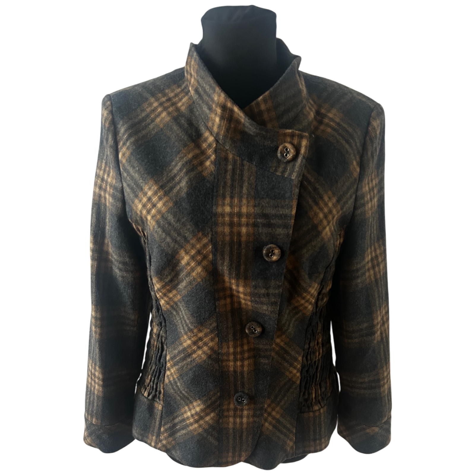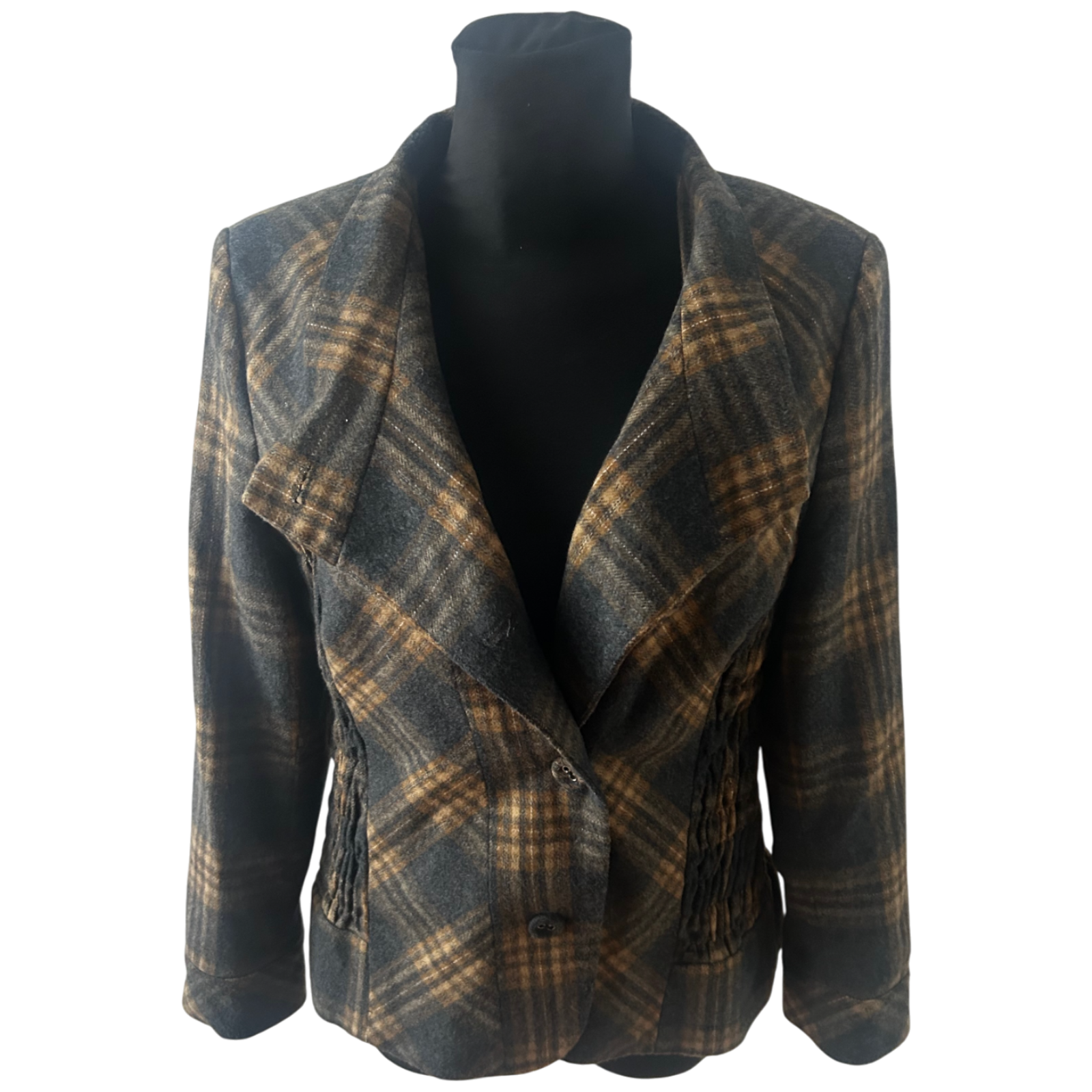 Diese warme und stilvolle Jacke von Himmelblau in Größe 42 überzeugt mit ihrem klassischen Karomuster und einer angenehmen Wollmischung. Das Modell hat eine besonders schöne Kragenlösung sowie geraffte Partien an den Seiten, die der Jacke eine feminine Linie geben. Die Brustweite beträgt ca. 50 cm, die Ärmellänge ca. 60 cm und die Gesamtlänge ca. 68 cm. Das Futter besteht aus 100% Polyester und sorgt für ein angenehmes Tragegefühl. Die Jacke eignet sich perfekt für kühlere Tage und lässt sich vielseitig kombinieren. ✨🧥