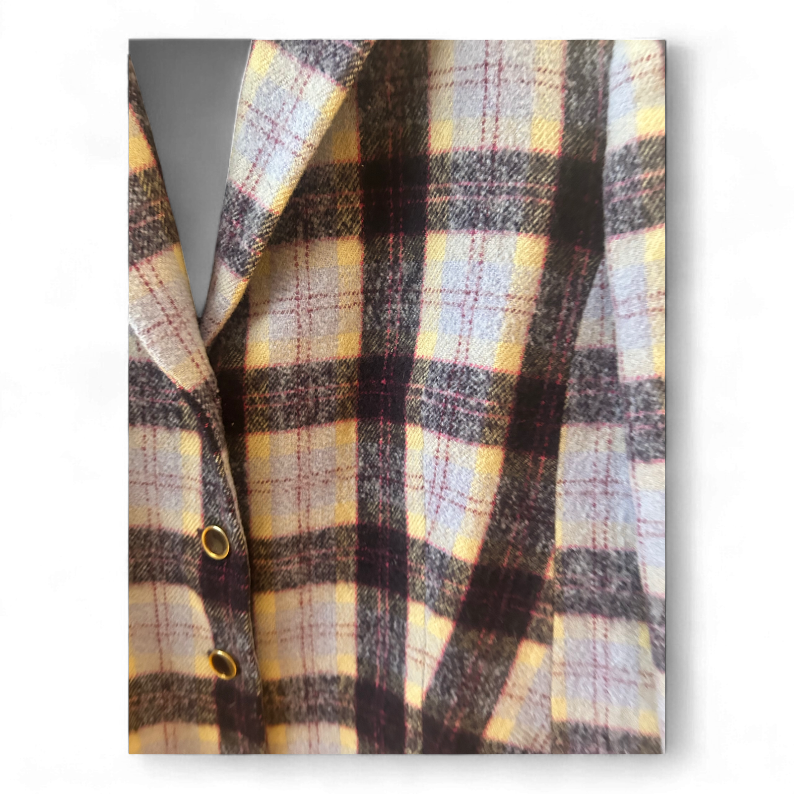 Wunderschöner kariert gemusterter Blazer von Hucke in einem kräftigen Violett-Gelb-Mix ✨. Der Blazer ist leicht gefüttert, etwas dicker und ideal für Herbst und Winter 🍂❄️. Die Brustweite beträgt 60 cm, die Länge 65 cm und die Ärmellänge 59 cm. Ein eleganter Klassiker mit goldfarbenen Knöpfen für stilvolle Auftritte 💼.