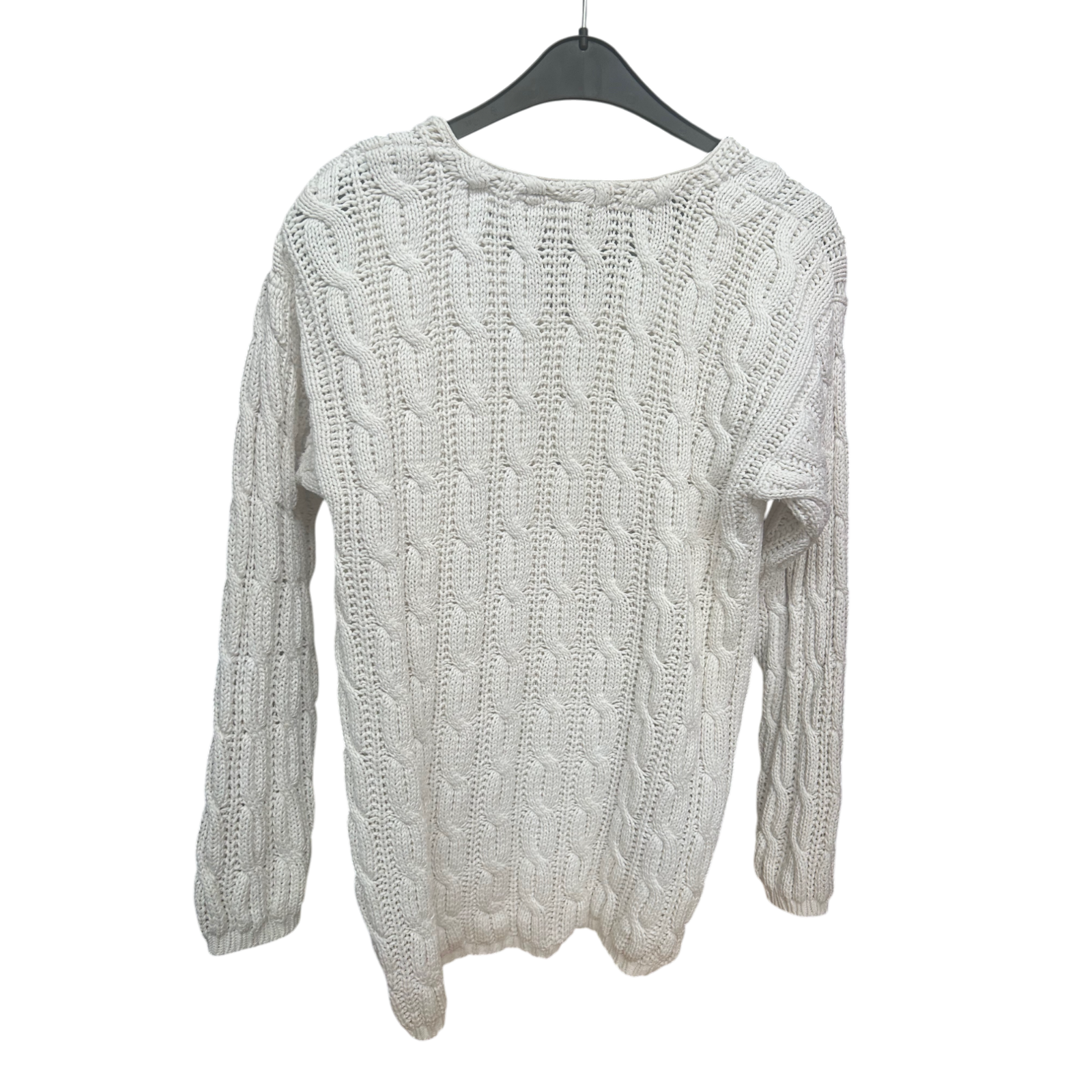 Stilvoller Longpullover von H&M in der Größe M. Der Pullover ist in klassischem Weiß gehalten und überzeugt mit einem zeitlosen Zopfmuster. Mit einer Länge von ca. 74 cm (ab Schulter gemessen) eignet sich der Pullover perfekt für einen lässigen Look mit Leggings oder engen Jeans. Das Material ist etwas steifer, was für eine gute Formstabilität sorgt.