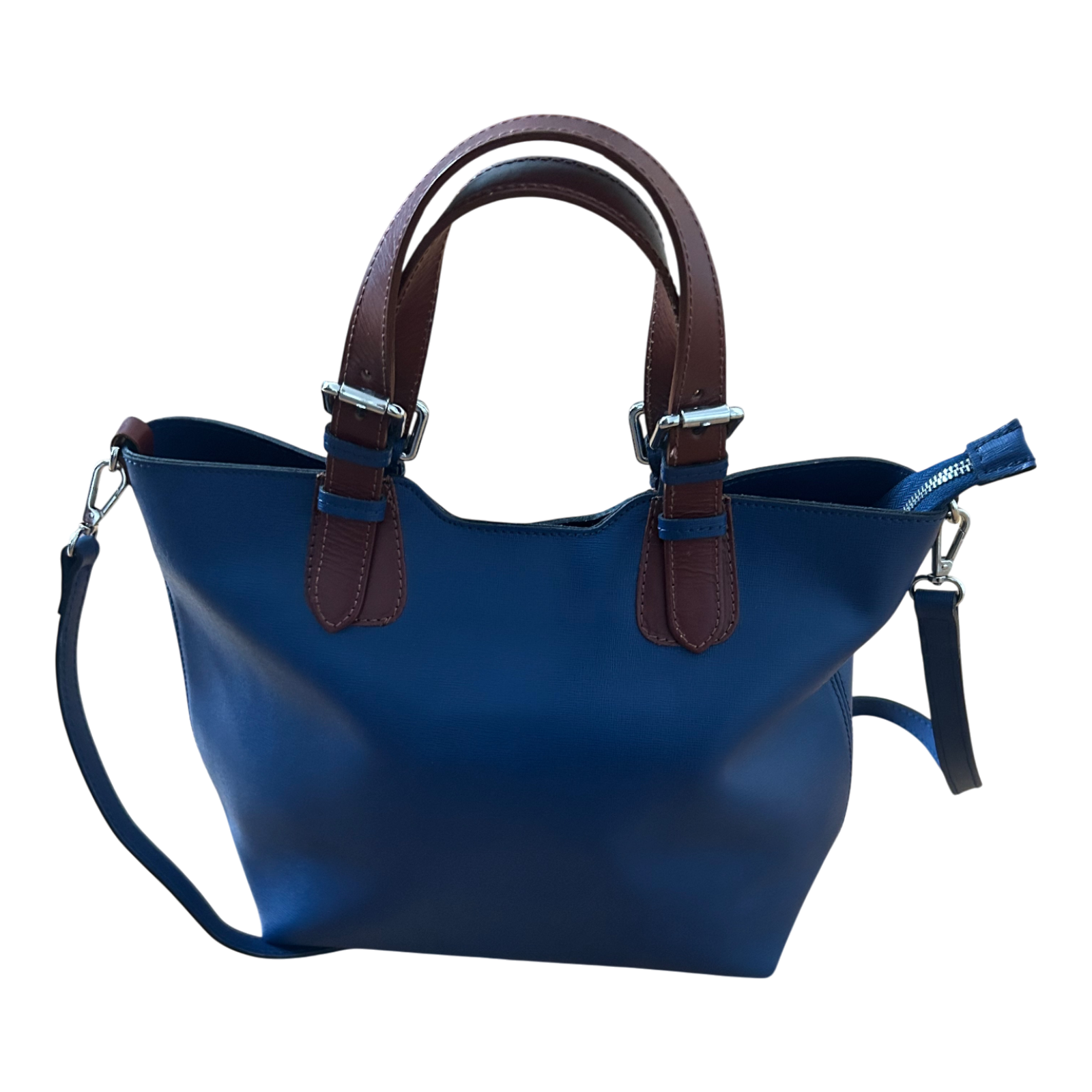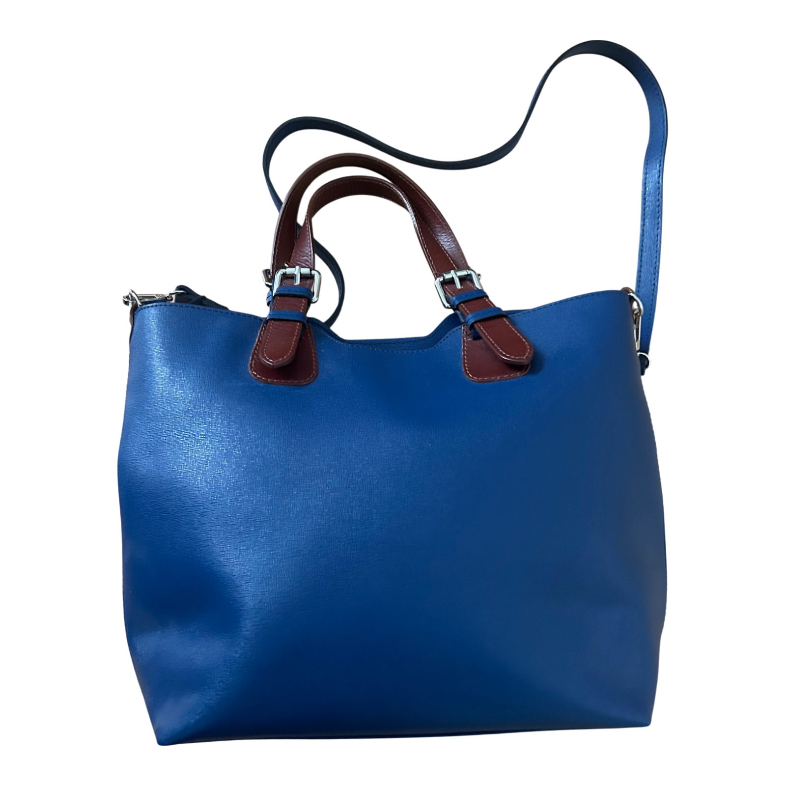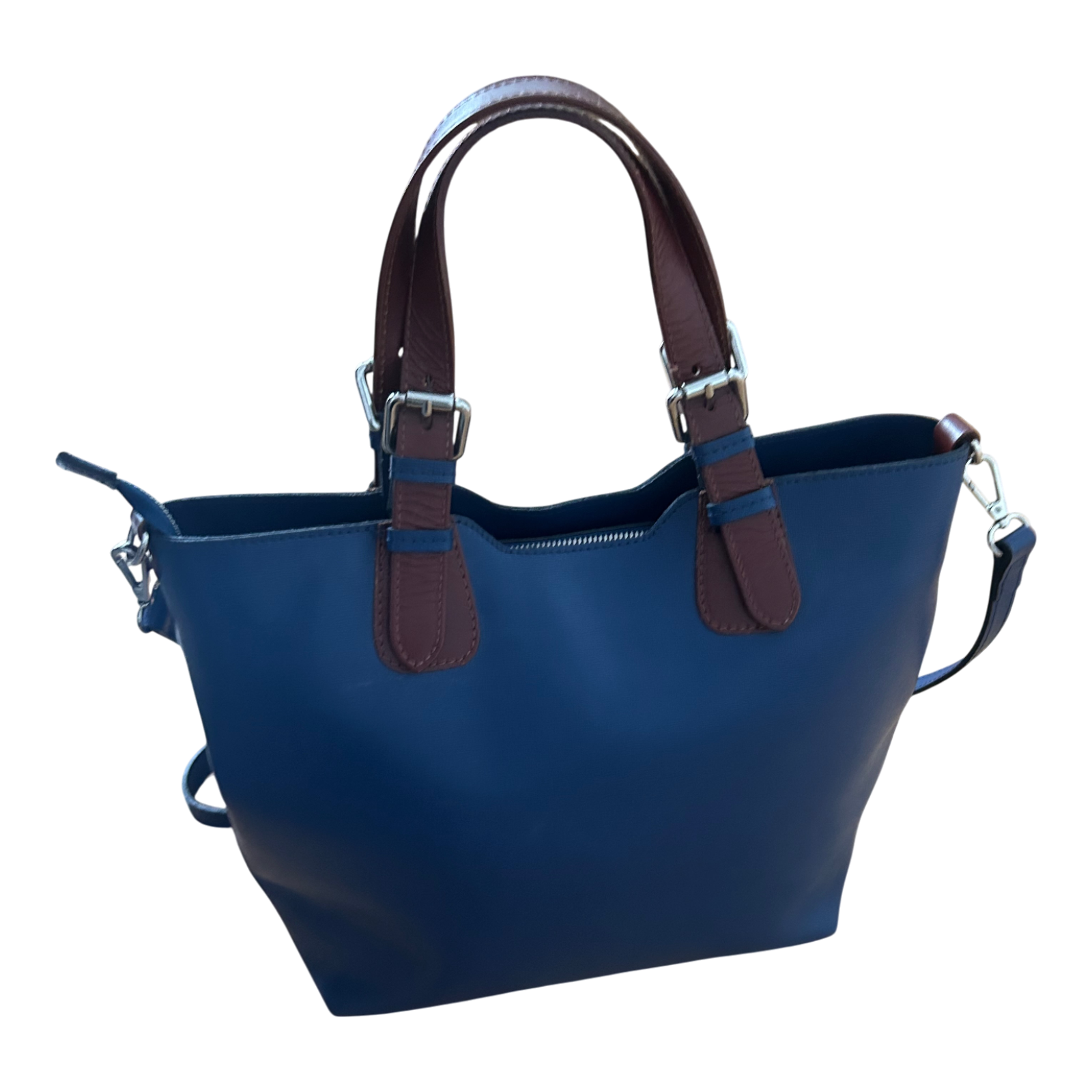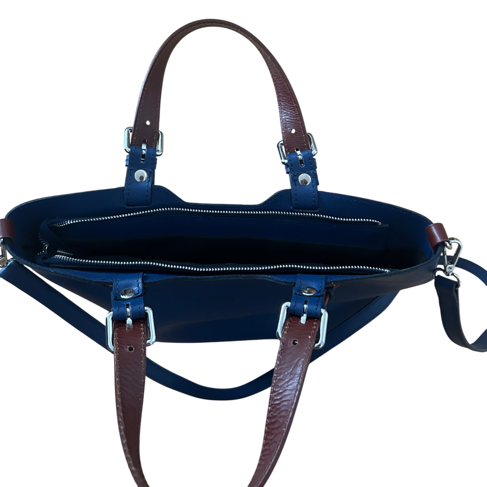 Diese elegante Echtleder-Tasche Made in Italy vereint zeitloses Design und hochwertige Verarbeitung. Die Kombination aus marineblauem Glattleder und braunen Riemen verleiht ihr eine edle, moderne Optik.