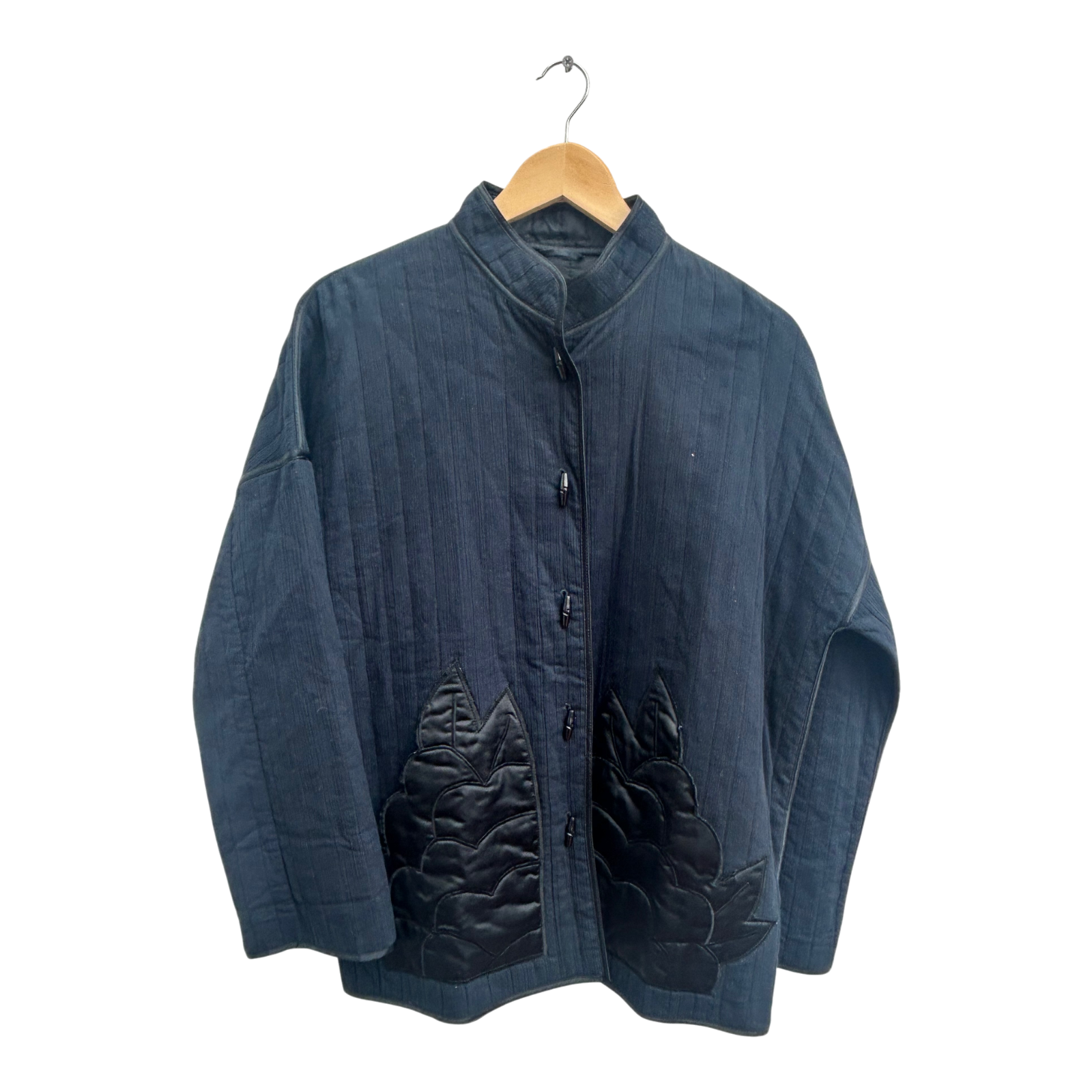 Die Jacke ist leicht wattiert, innen schwarz gefüttert und wird mit glänzenden Knöpfen geschlossen. Die auffälligen, floral inspirierten Applikationen verleihen ihr einen kunstvollen, japanisch anmutenden Look 🌸.