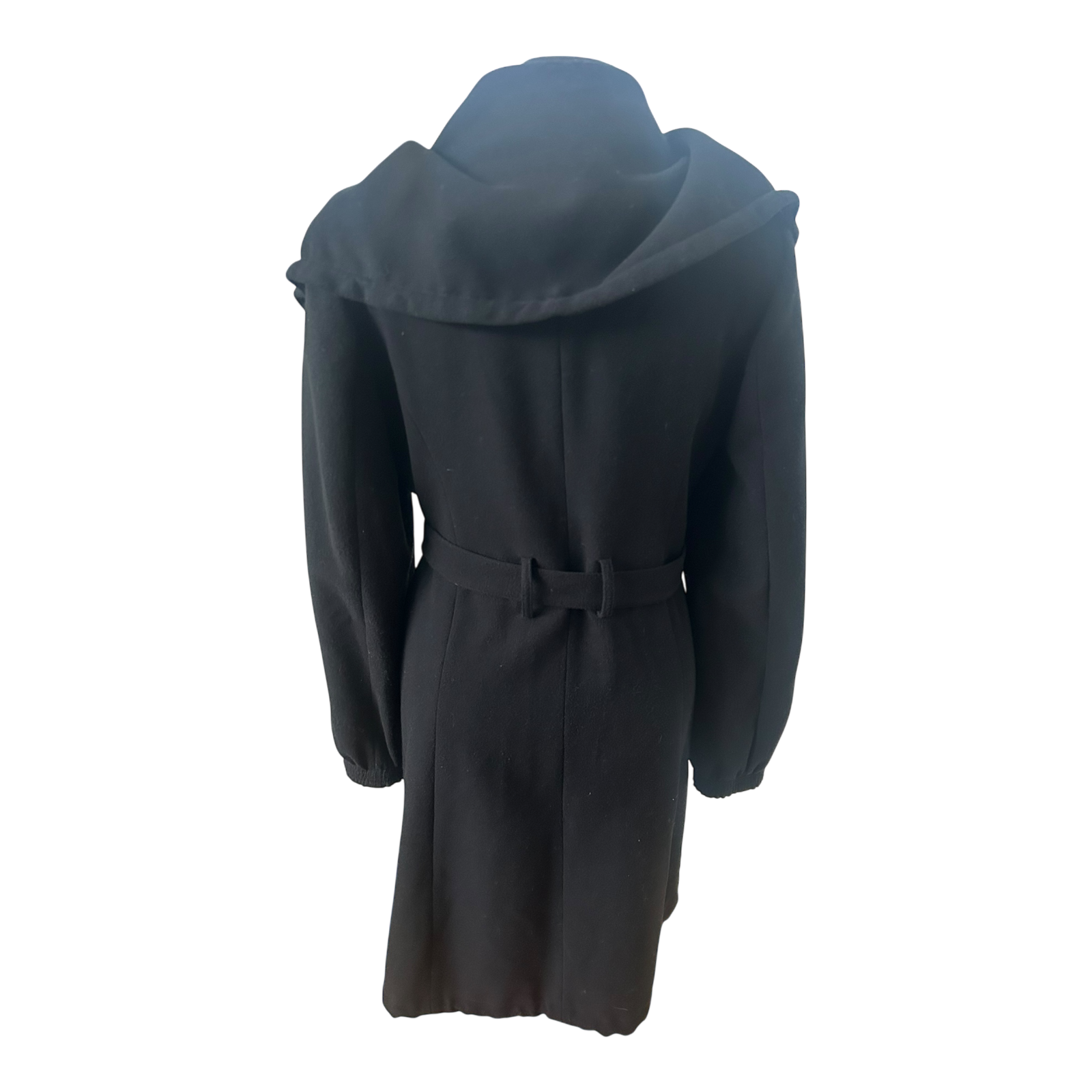 Eleganter schwarzer Damenmantel von Jakes in Größe 40 mit großem Kragen und hochwertiger Verarbeitung. Besonderes Highlight sind die durchdachten Details: Der Mantel hat einen klassischen Taillengürtel zum Binden sowie zusätzlich ein Bindeband im unteren Bereich und ein weiteres Bindeband am großen Kragen, wodurch sich der Look je nach Styling variieren lässt.