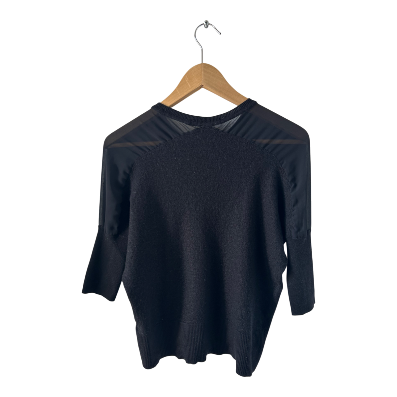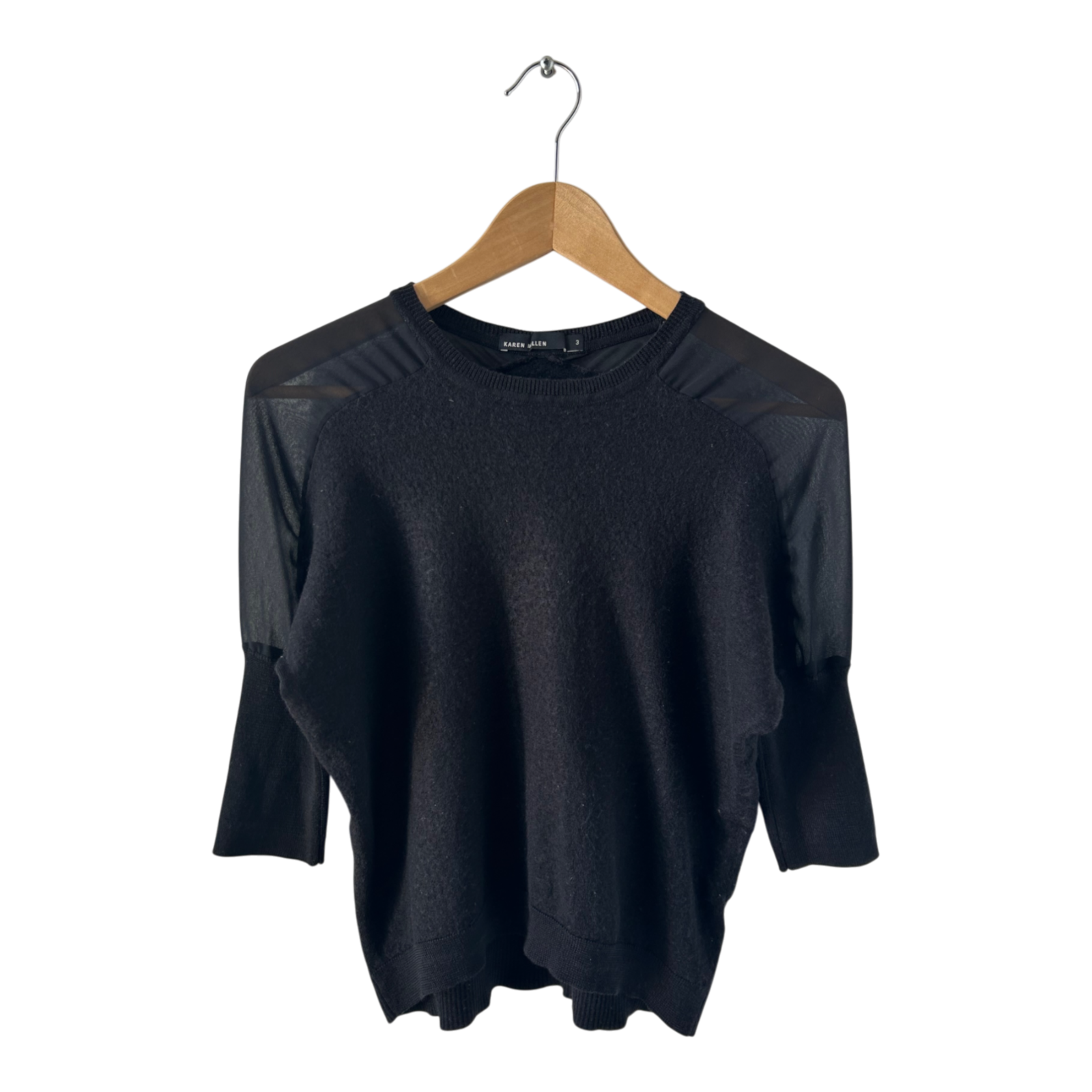 Edler Damen Pullover von Karen Millen in Größe 3, entsprechend ca. deutscher Größe 38–40 (M). Das schwarze Oberteil überzeugt durch seine elegante Schlichtheit mit modernen Details: transparente Partien an den Schultern und 3/4-Ärmel geben dem Feinstrick eine raffinierte Note. Mit einer Brustweite von ca. 52 cm und einer Länge von ca. 56 cm sitzt der Pullover locker, aber dennoch feminin.