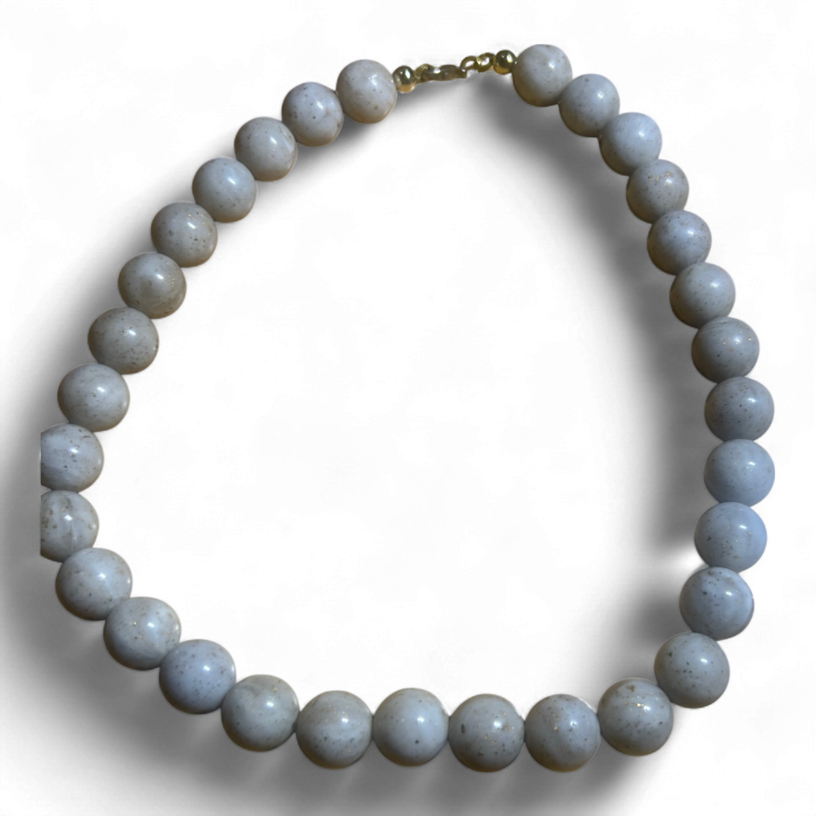 Diese edle Vintage-Kette in Weiß misst 43 cm und besticht durch ihren sanft geprenkelt-glitzernden Effekt ✨ Die gleichmäßigen Kugeln reflektieren das Licht dezent und verleihen deinem Look eine stilvolle Note 💫 Der goldfarbene Schraubverschluss rundet das klassische Design elegant ab – perfekt für Alltag, Business oder festliche Anlässe 🎀