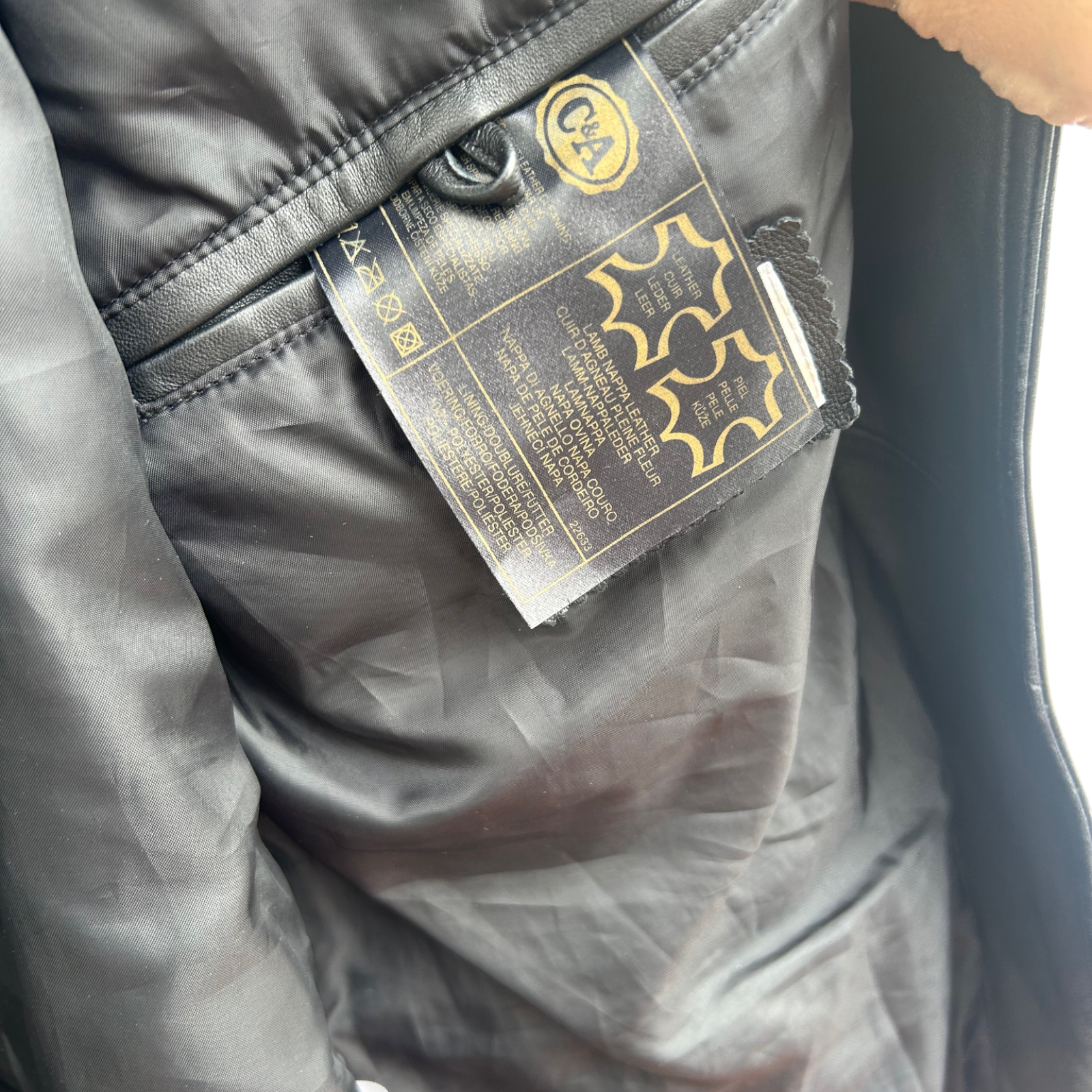 Klassische schwarze Lederjacke von C&A in Größe 42 aus feinem, geschmeidigem Echtleder. Das Modell kombiniert Biker-Elemente wie den asymmetrischen Reißverschluss mit der eleganten Länge eines Kurzmantels. Vier Reißverschlusstaschen und ein Bindegürtel betonen den femininen Schnitt und sorgen für eine markante Silhouette.