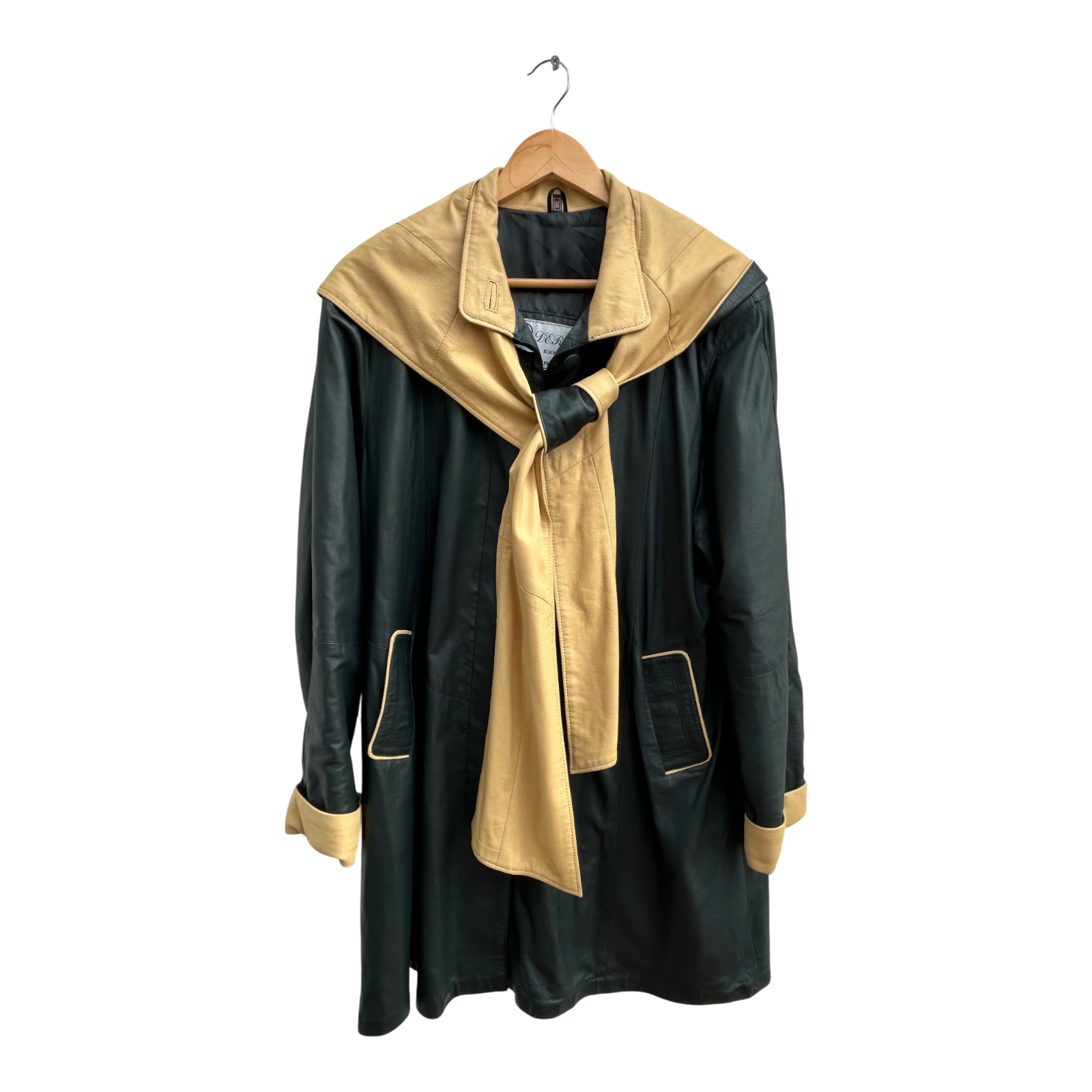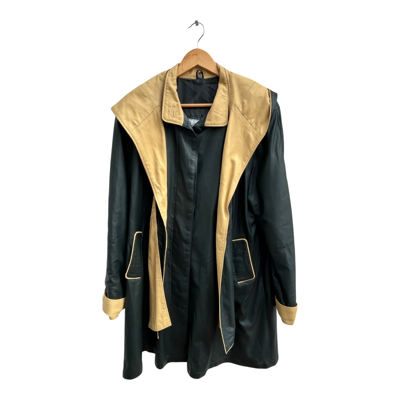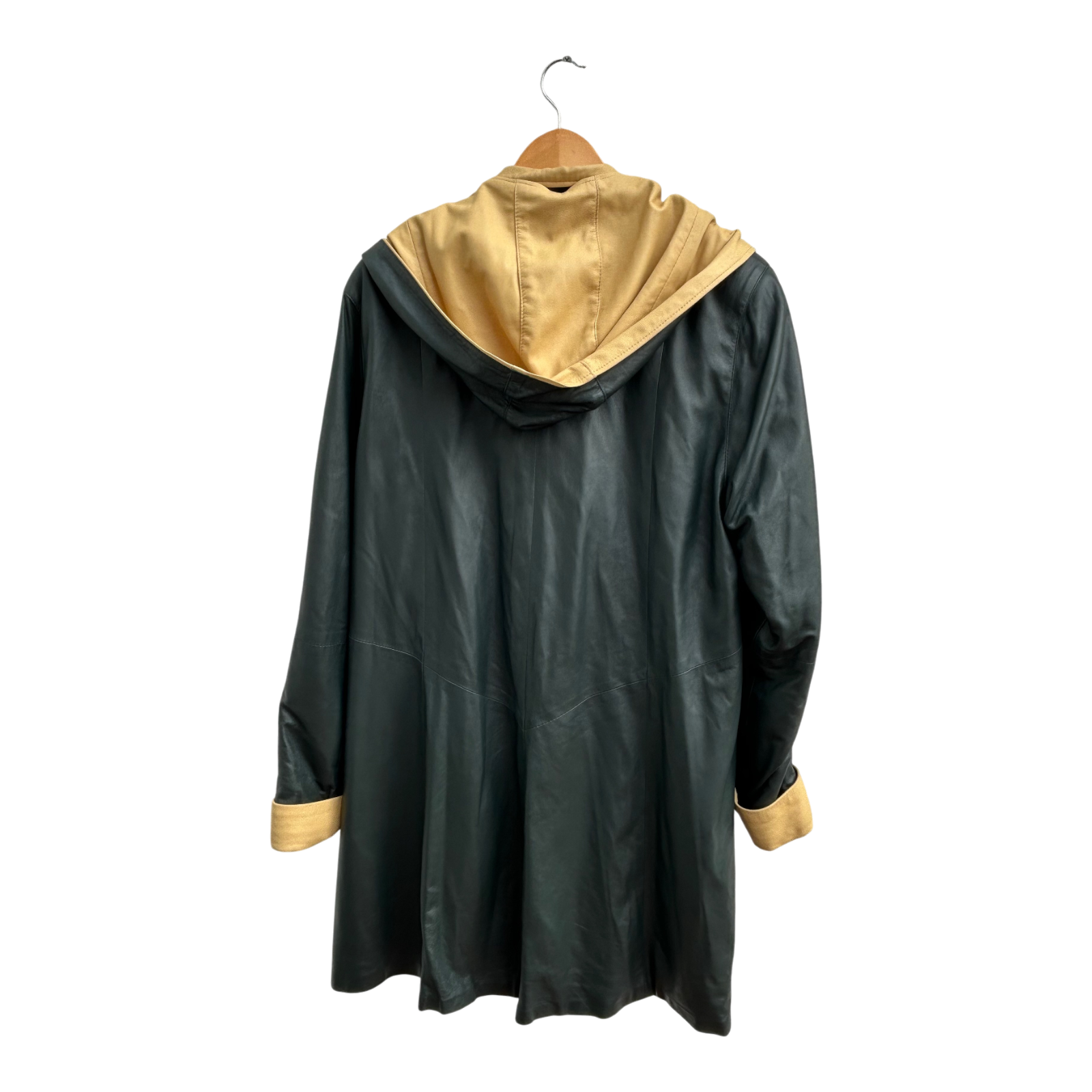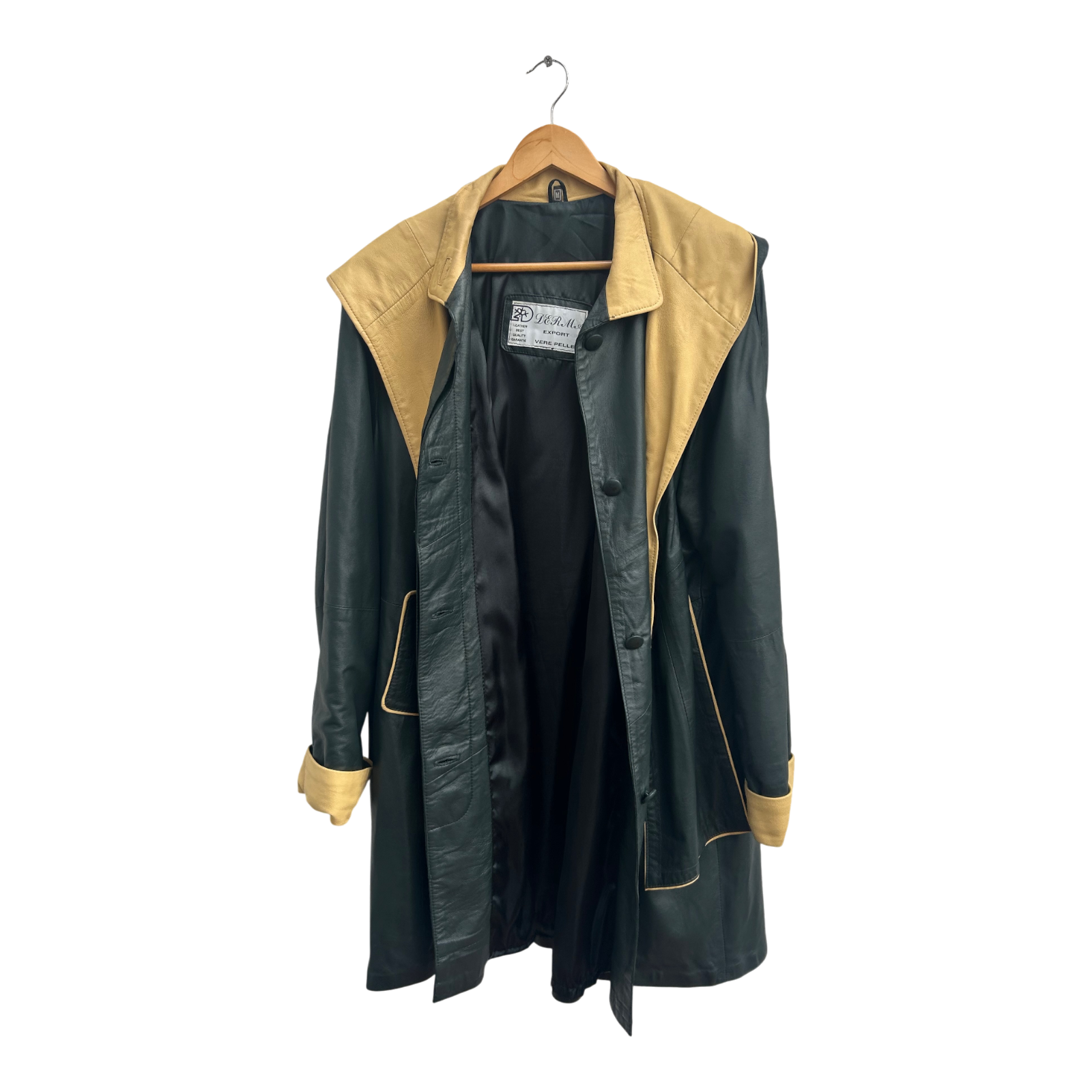 Luxuriöser zweifarbiger Ledermantel von Verre Pelle / DEER in Größe M. Gefertigt aus besonders weichem, hochwertigem Echtleder in Dunkelgrün und hellem Beige. Der Mantel besticht durch sein außergewöhnliches Design mit abnehmbarer Kapuze, verdeckter Knopfleiste und kontrastierenden Details an Taschen, Kragen und Ärmelaufschlägen. Das Leder ist wunderbar geschmeidig, leicht glänzend und fällt elegant.