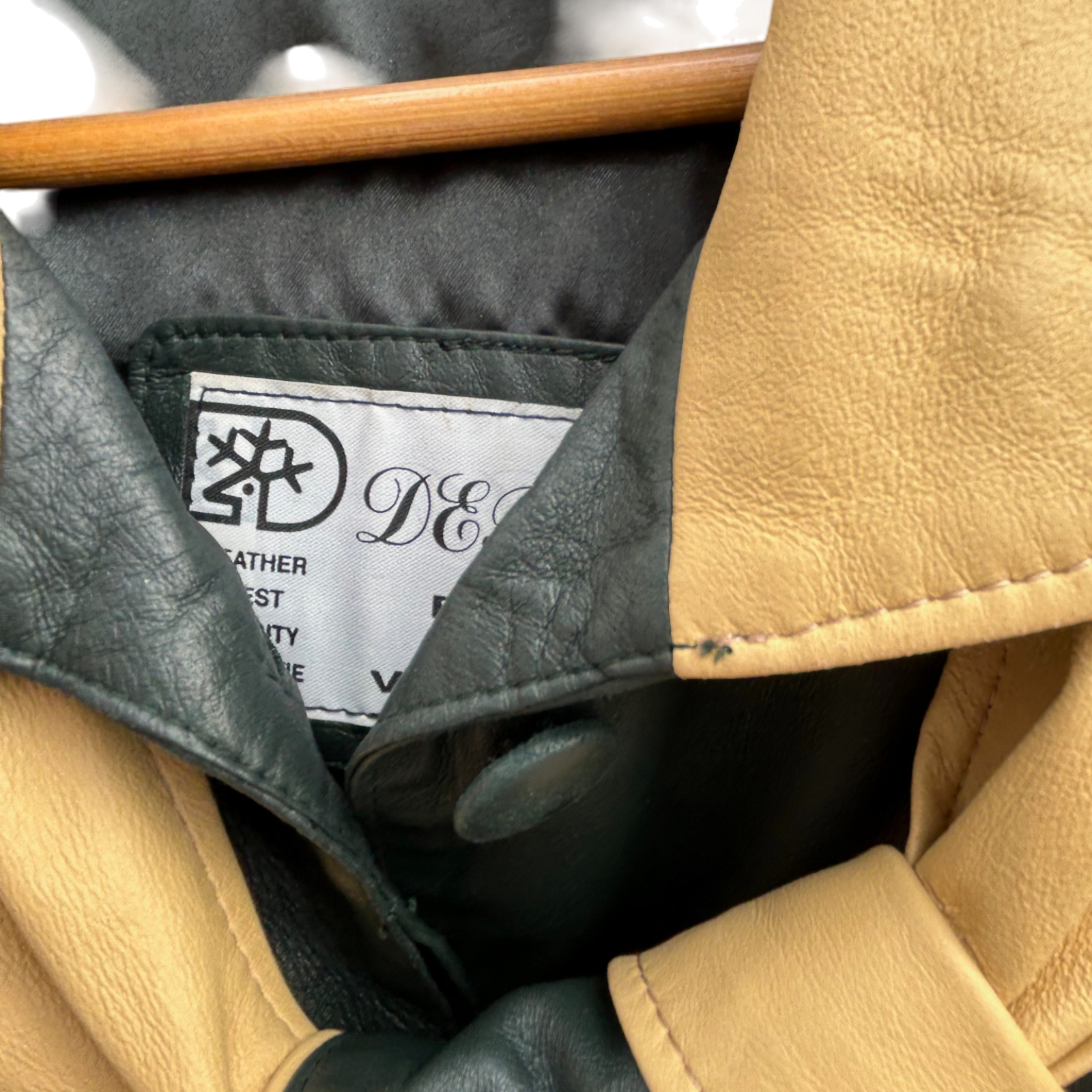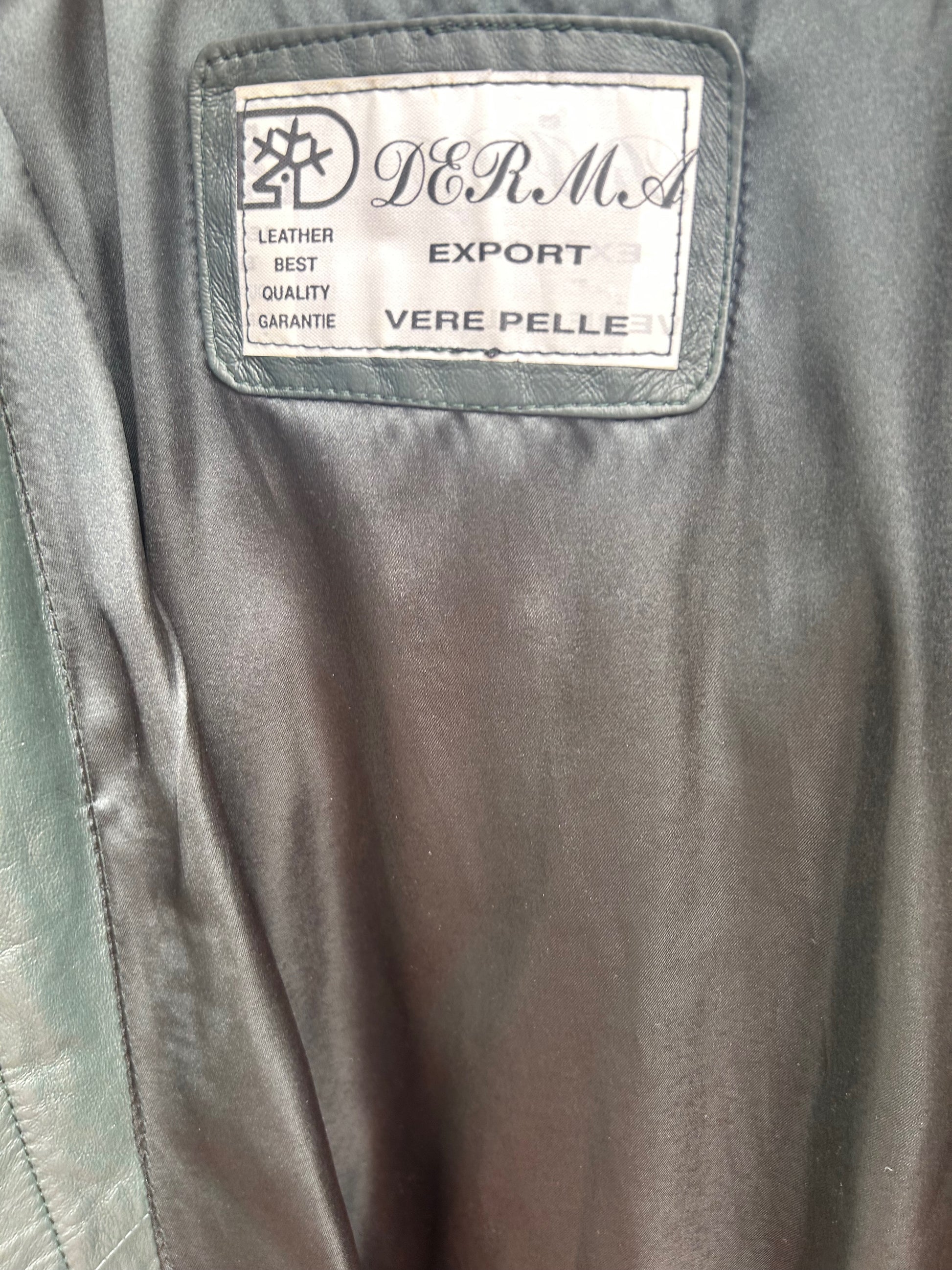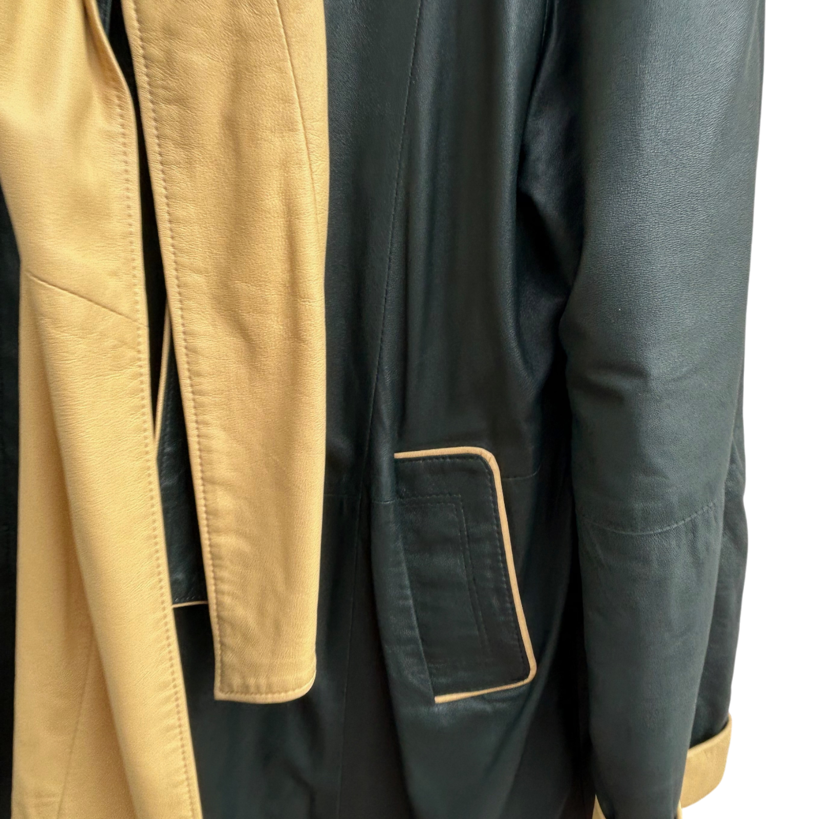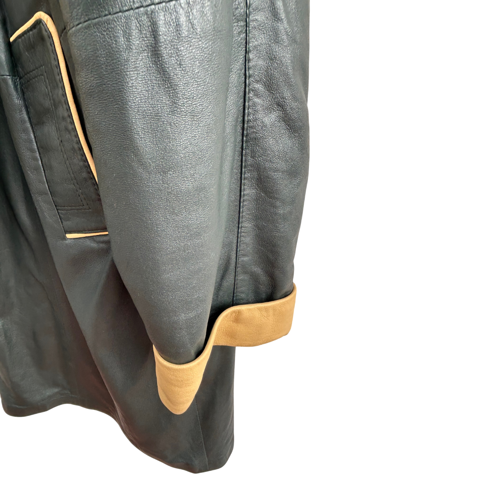 Luxuriöser zweifarbiger Ledermantel von Verre Pelle / DEER in Größe M. Gefertigt aus besonders weichem, hochwertigem Echtleder in Dunkelgrün und hellem Beige. Der Mantel besticht durch sein außergewöhnliches Design mit abnehmbarer Kapuze, verdeckter Knopfleiste und kontrastierenden Details an Taschen, Kragen und Ärmelaufschlägen. Das Leder ist wunderbar geschmeidig, leicht glänzend und fällt elegant.