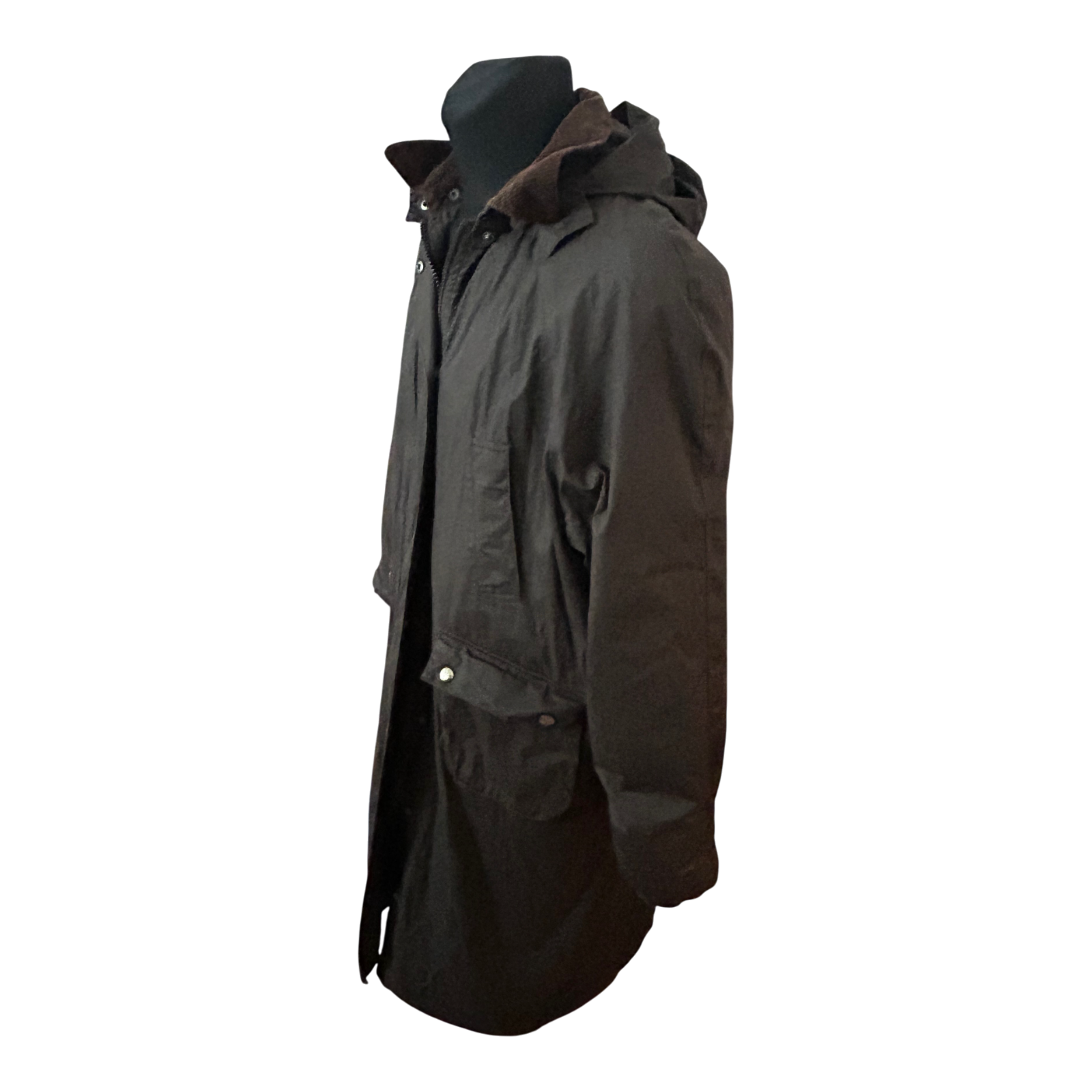 Geschlossen wird der Mantel über einen durchgehenden Reißverschluss, der sich auch von unten öffnen lässt, sowie über Druckknöpfe. Die Ärmel sind mit Bündchen versehen, was für zusätzlichen Windschutz sorgt. Farblich ist der Mantel in einem dunklen Braunton gehalten.