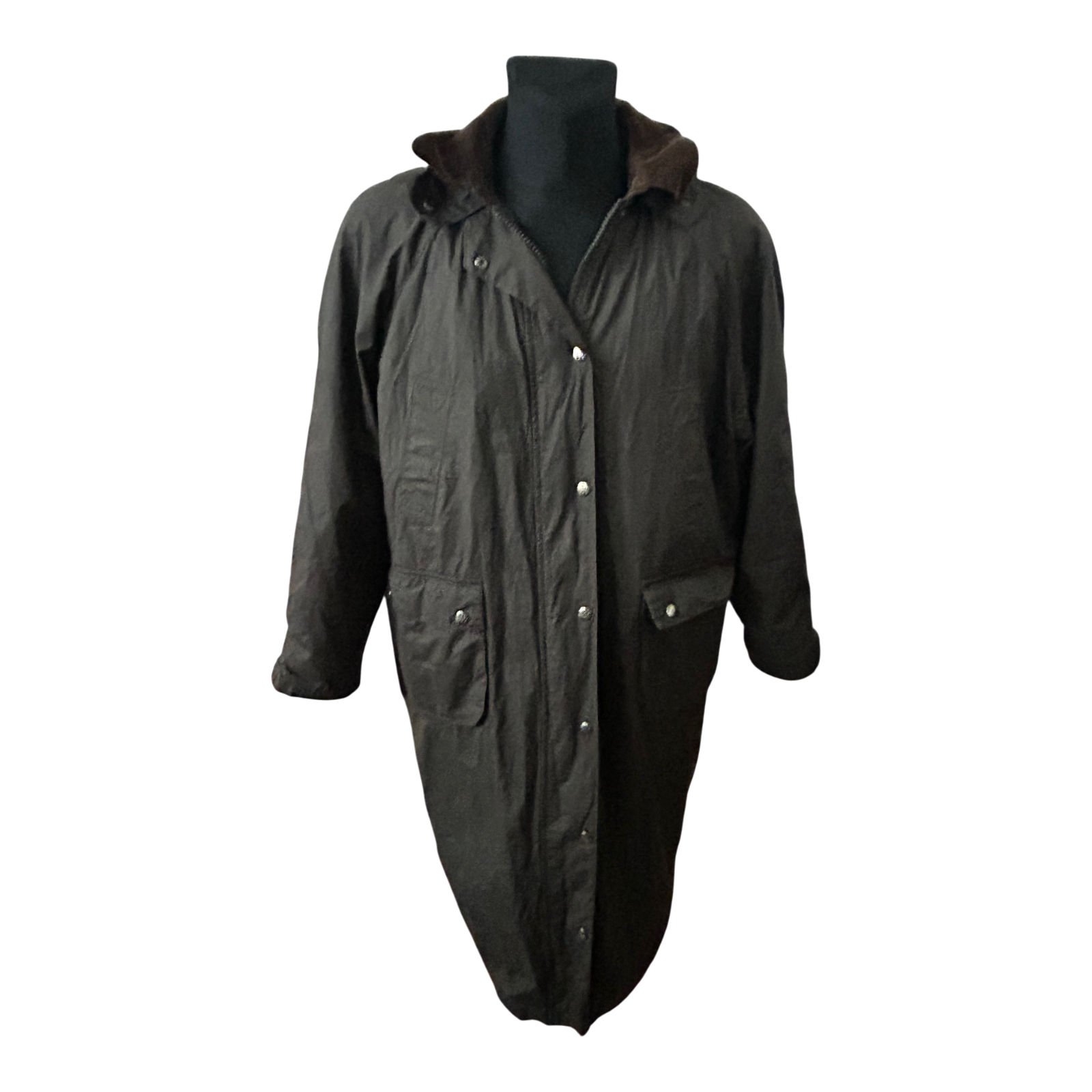 Die Größe ist L. Die Brustweite beträgt ca. 60 cm, die Ärmellänge ca. 68 cm und die Gesamtlänge ca. 118 cm. Ein praktischer, robuster Mantel für Outdoor-Aktivitäten, Spaziergänge, Reiten oder den Alltag bei kühlerem Wetter.
