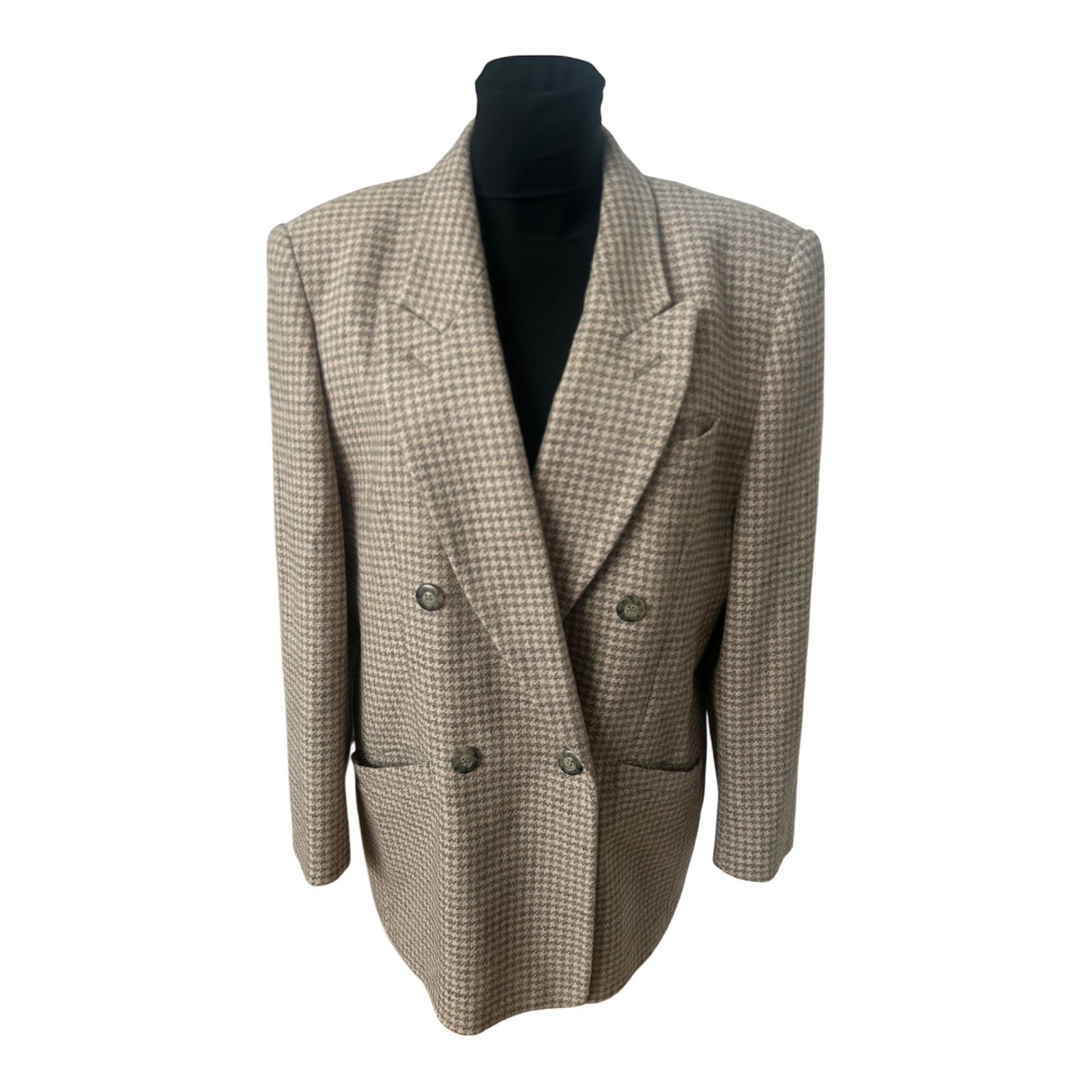 Dieser besondere Vintage-Blazer von Madeleine in Größe 42 ist ein echtes Statement-Stück mit klassischer Eleganz. Das hochwertige Obermaterial aus 50 % Schurwolle, 30 % Alpaka und 20 % Polyester sorgt für eine warme, strukturierte und sehr edle Optik. Das feine Hahnentrittmuster in einem zarten Rose-Grau wirkt außergewöhnlich stilvoll und dezent zugleich. Der doppelreihige Schnitt mit Reverskragen unterstreicht den hochwertigen Vintage-Charakter dieses besonderen Stücks. Innen ist der Blazer vollständig mit 100 % Viskose gefüttert und trägt sich angenehm. Die Brustweite beträgt ca. 52 cm, die Ärmellänge ca. 60 cm und die Gesamtlänge ca. 75 cm. Ein wirklich außergewöhnlicher Fund für Liebhaberinnen hochwertiger Vintage-Mode. 🤍✨