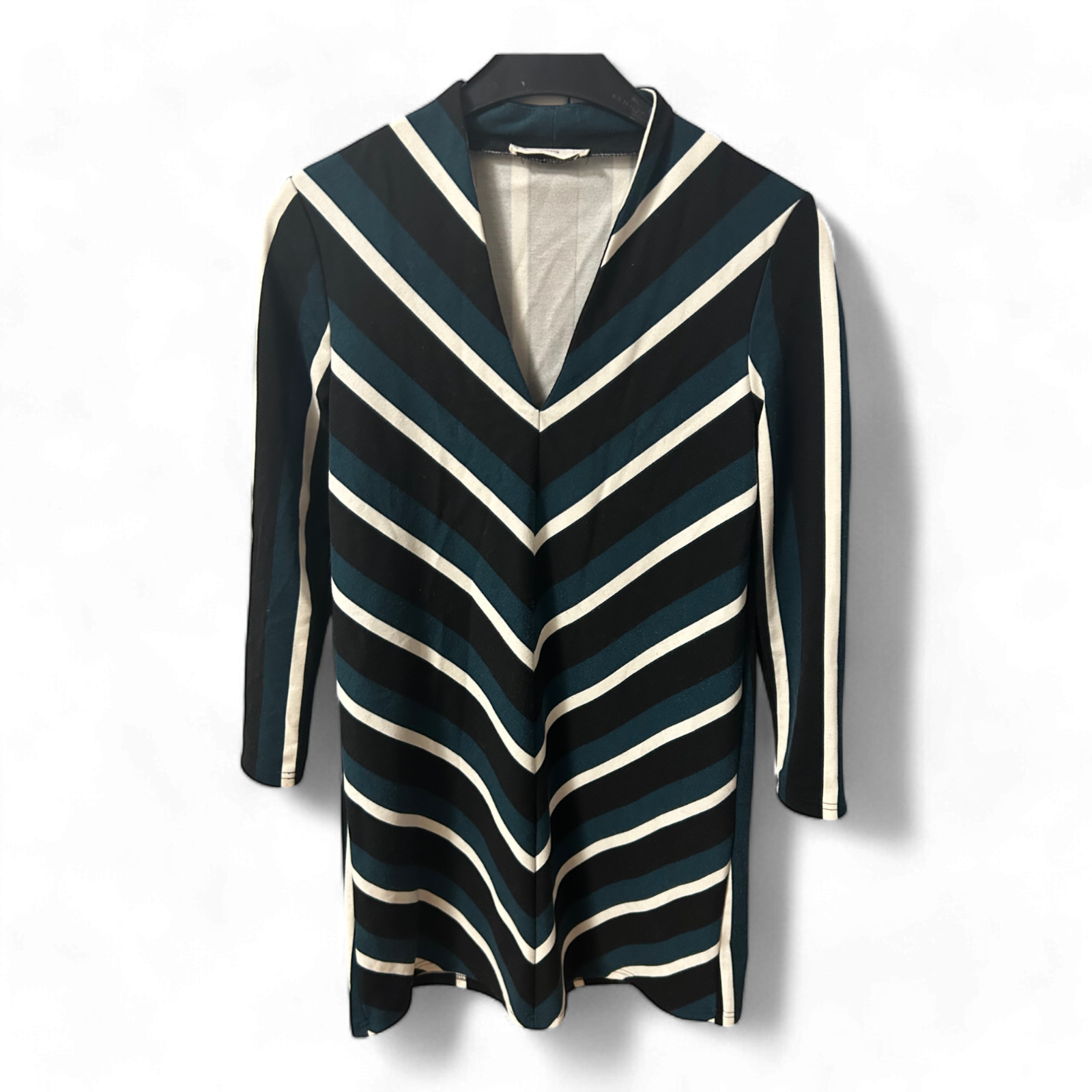 Schickes Stretchkleid von Mango in den Farben Grün, Schwarz und Weiß, Größe XS. Das Kleid zeichnet sich durch ein modernes, dynamisches Design aus, das mit kontrastierenden Farbstreifen oder Mustern spielt, und bietet gleichzeitig einen hohen Tragekomfort dank des dehnbaren Materials. Ideal für den Alltag oder auch für besondere Anlässe, es lässt sich vielseitig kombinieren. Das figurbetonte Kleid betont die Silhouette und sorgt für einen eleganten Look.