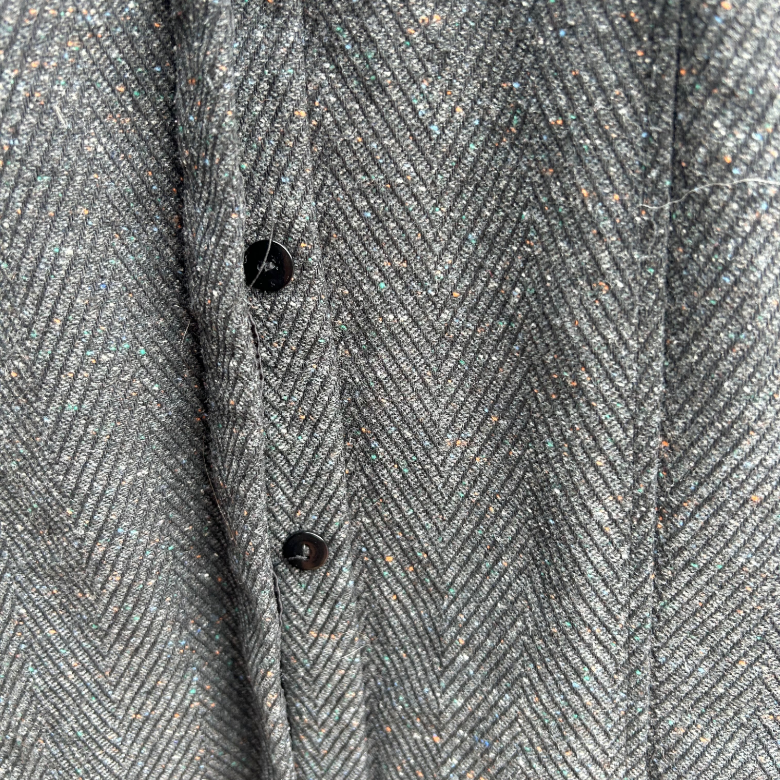 Die Ärmel fallen eher kurz aus (55 cm), was dem Mantel eine betont figurbetonte Silhouette verleiht. Das Fischgrät-Muster und die Reißverschlusstaschen runden das Design stilvoll ab.