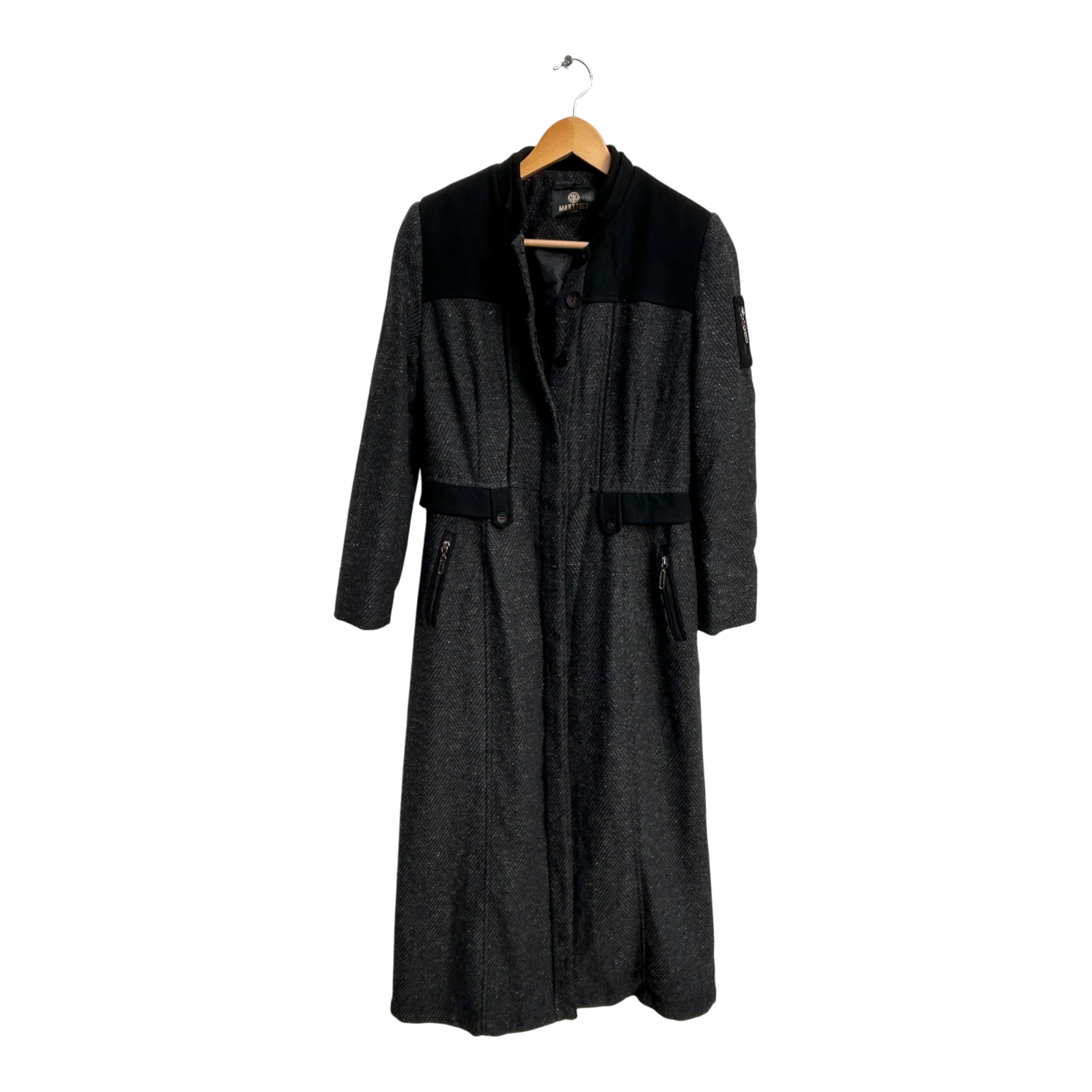 Dieser elegante Mantel von Manttocu Luxury in Größe 38 besticht durch seinen langen, schmalen Schnitt und edle Verarbeitung. Die hochwertige Wollmischung sorgt für Wärme und Formstabilität, während die Schulterpolster und die kontrastierenden Einsätze an Taille und Schultern den Look modern und klar wirken lassen.