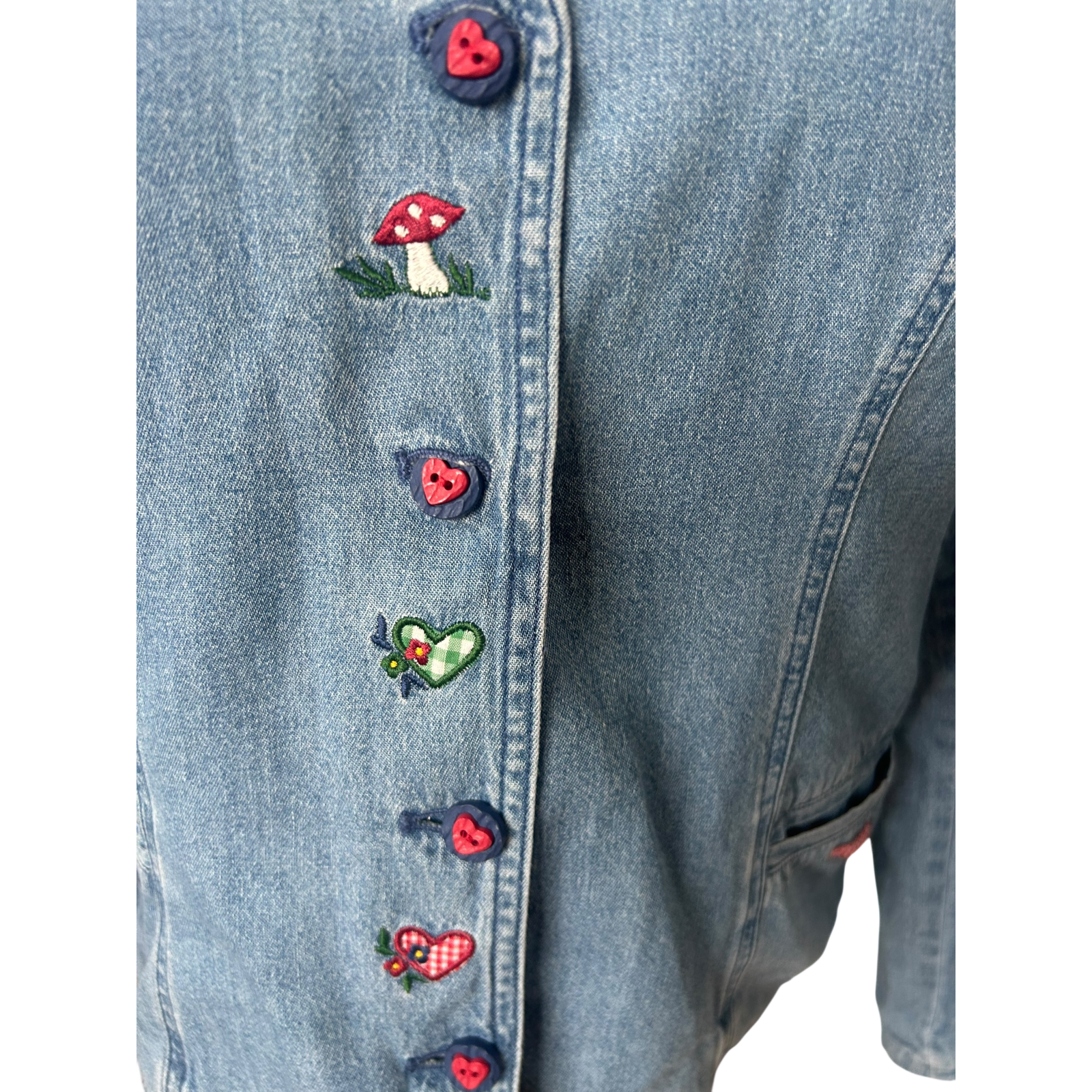 Diese liebevoll gestaltete Jeansjacke in Größe 40 im Landhaus-Look von Meico ist ein echtes Besonderes Stück. Die helle Denimfarbe wirkt frisch und zeitlos, während die vielen kleinen Details sofort ins Auge fallen. Die dekorativen Knöpfe mit Herzmotiven sowie die feinen Stickereien mit Pilz- und Herzmotiven verleihen der Jacke ihren charmanten Trachtencharakter 🌸🧵