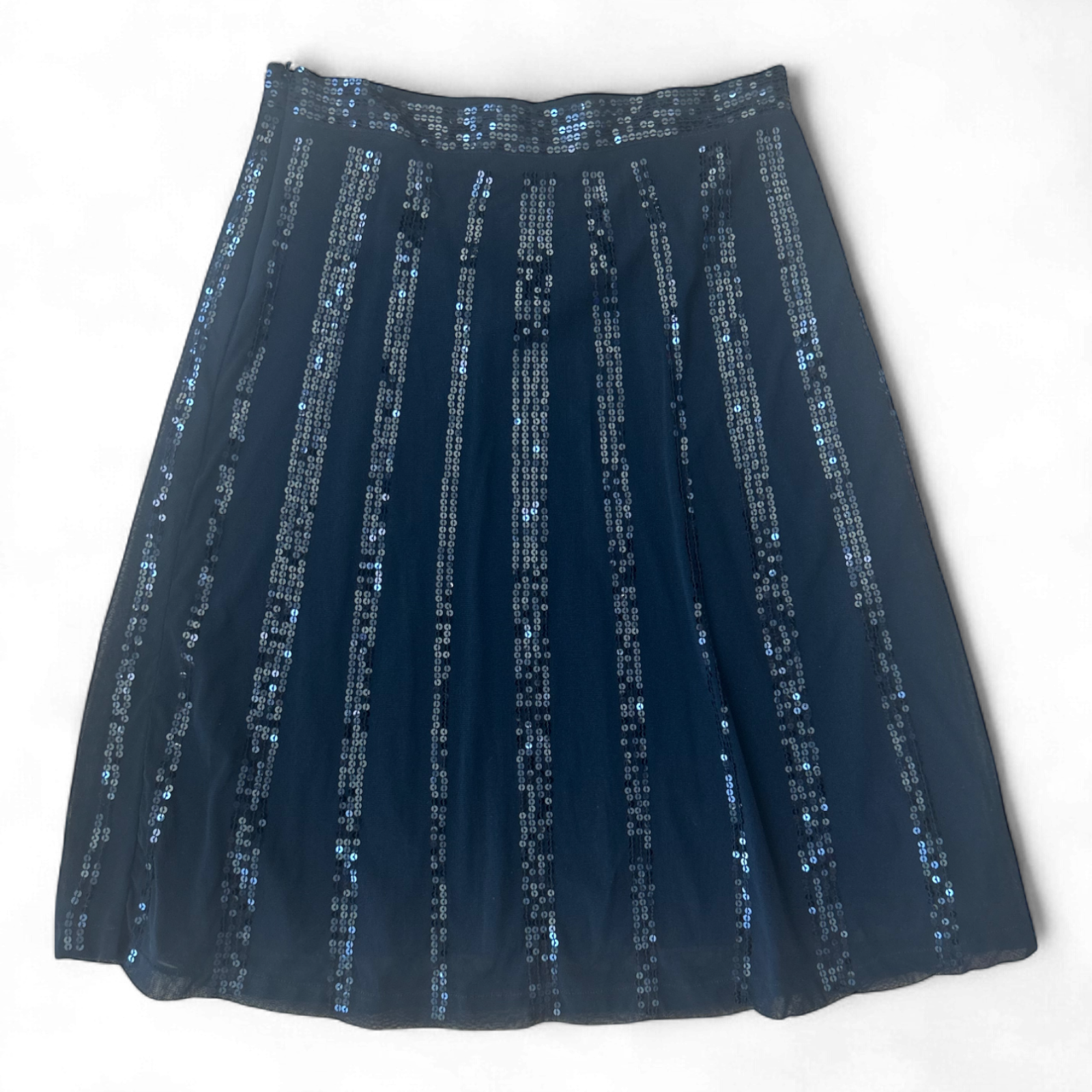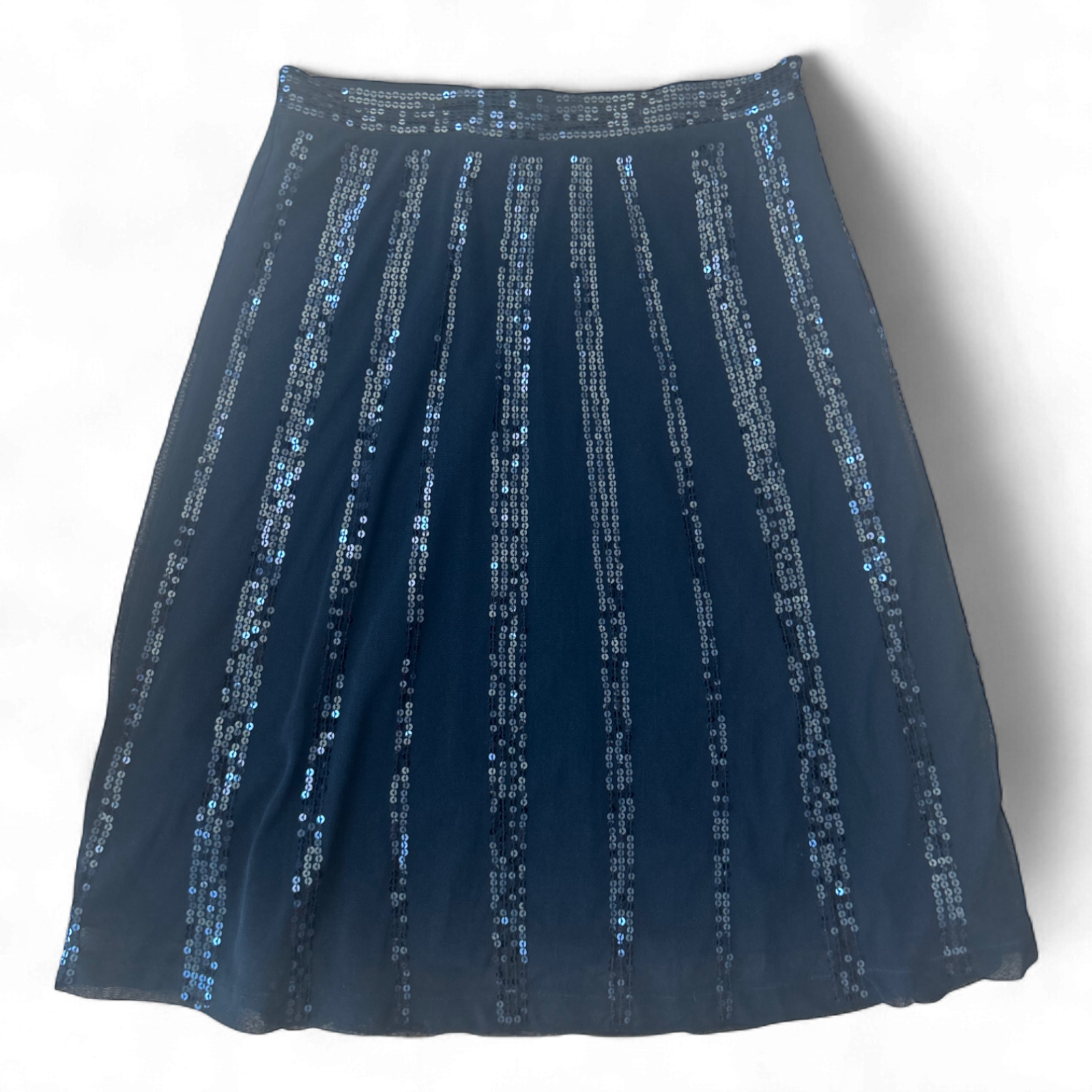 Eleganter, schwarzer Rock von Mexx in Größe L ✨. Das Modell ist mit feinem Tüll überzogen und mit senkrechten Paillettenstreifen geschmückt, die für einen edlen Glanz sorgen. Der Rock ist vollständig gefüttert, besteht aus 100 % Nylon und fällt leicht ausgestellt in knielanger bis wadenbedeckender Länge. Die Bundweite beträgt ca. 42 cm, die Länge ca. 68 cm. Perfekt geeignet für festliche Anlässe, Abendveranstaltungen oder als glitzernder Eyecatcher zu schlichten Oberteilen. Der Zustand ist sehr gut – kaum getragen 🖤.