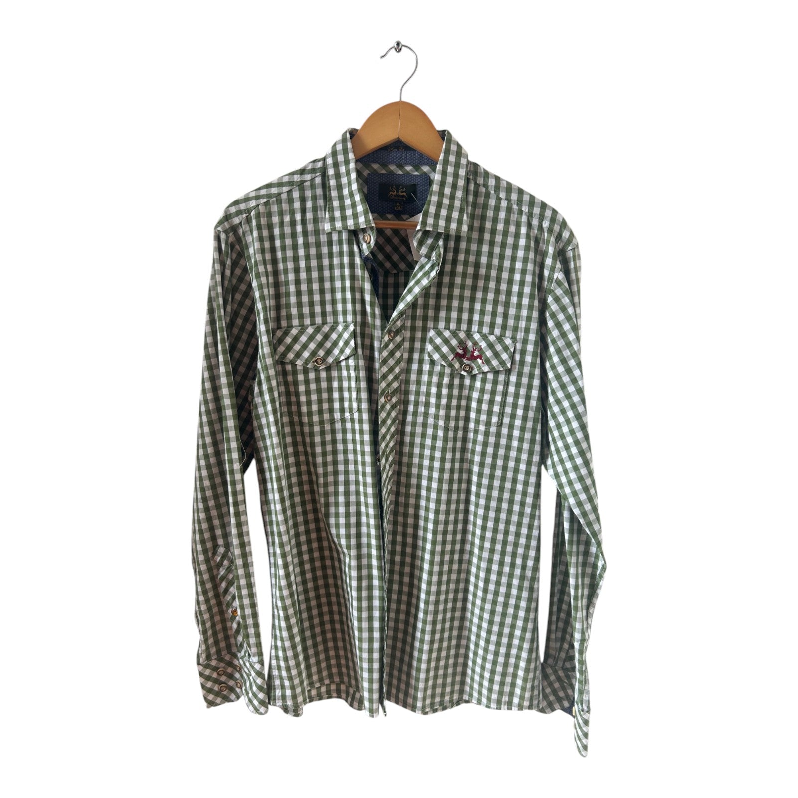 Das grün-weiß karierte Muster verleiht dem Hemd einen traditionellen Trachten-Look, während die aufgesetzten Brusttaschen und die rote Stickerei mit Hirschmotiv auf Brusttasche und Rücken besondere Akzente setzen. Mit einer Brustweite von 56 cm, einer Länge von 72 cm und einer Armlänge von 70 cm passt es hervorragend für Herren, die Wert auf stilvolle Trachtenmode legen. 🍻