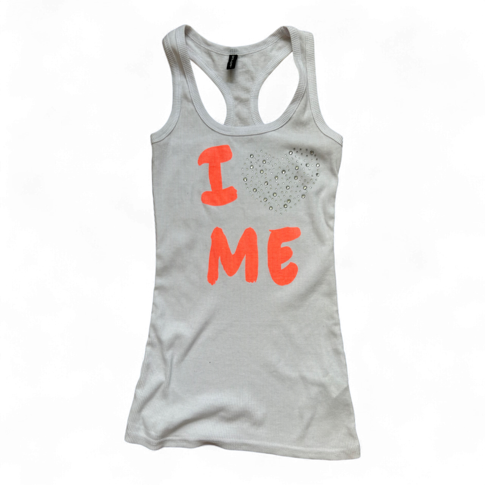 Cooles weißes Racerback-Tanktop von One Love in Größe S 💫 Der auffällige "I ❤️ ME"-Print mit Strasssteinchen sorgt für einen Hingucker-Effekt ✨ Mit einer Brustweite von 40 cm und einer Länge von 70 cm sitzt es körpernah und bequem 💖 Der Materialmix aus 60 % Baumwolle und 40 % Polyester ist elastisch und angenehm zu tragen – perfekt für heiße Tage ☀️