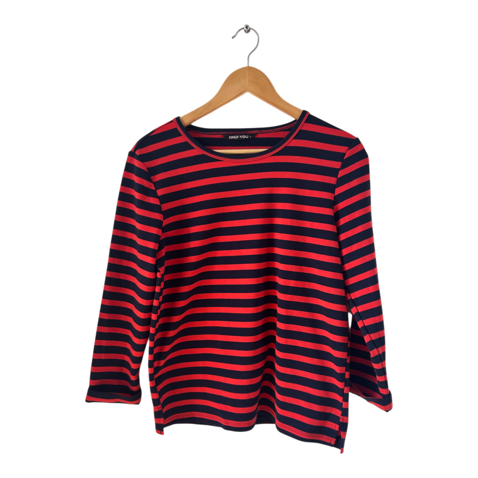 Modisches Damen Shirt von Only You in Größe M. Das Oberteil zeigt ein klassisches Streifenmuster in Rot und Dunkelblau, das modern und sportlich zugleich wirkt. Mit einer Brustweite von ca. 46 cm und einer Länge von ca. 63 cm bietet es eine bequeme Passform. Kleine Seitenschlitze verleihen dem Shirt einen legeren Fall und mehr Bewegungsfreiheit.