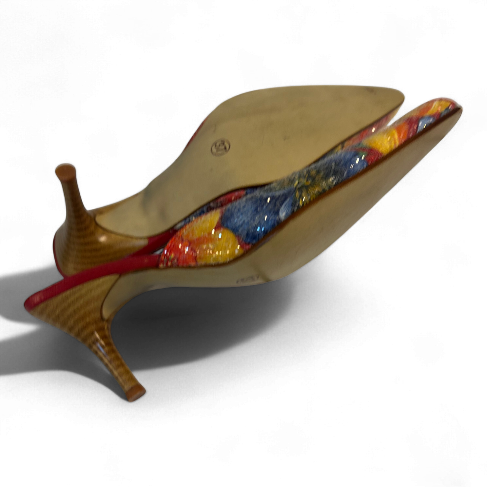 Diese außergewöhnlichen Mules von Pascual Alonso 🌺 sind ein echter Blickfang! Der farbenfrohe Blumenprint mit zartem Glitzer verleiht den Schuhen eine elegante, verspielte Note ✨. Die spitze Form und der schmale Absatz strecken optisch das Bein und sorgen für einen femininen Auftritt 👠. Die Innensohle ist aus hochwertigem Leder in kräftigem Rot gearbeitet ❤️. Die Schuhe befinden sich in sehr gutem Zustand – perfekt für besondere Anlässe oder als farbenfrohes Statement im Alltag 🌸.