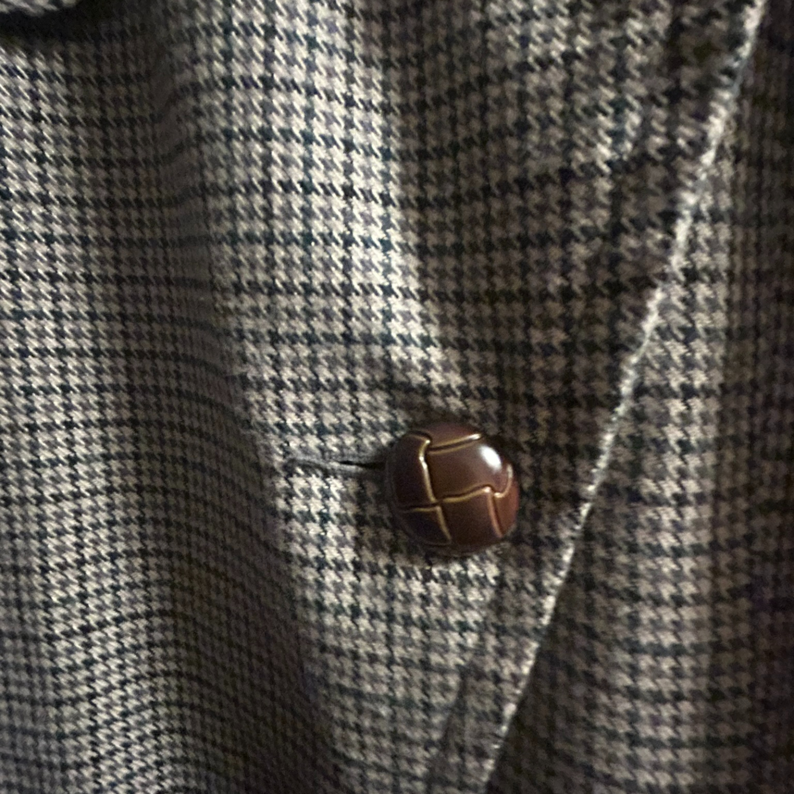 - Akzente: Gürtel, Schulterriegel, Hahnentritt, Knöpfe mit Logo