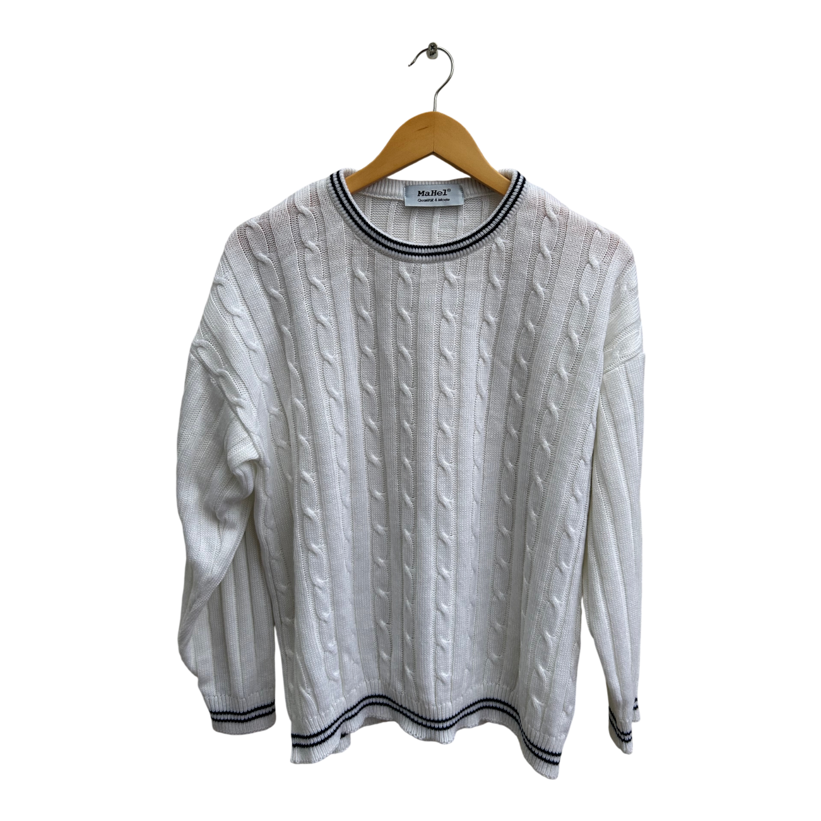 Pullover Herren Gr XL MaHel Weiß Marine Zopfmuster Strick kurz geschnitten klassisch
