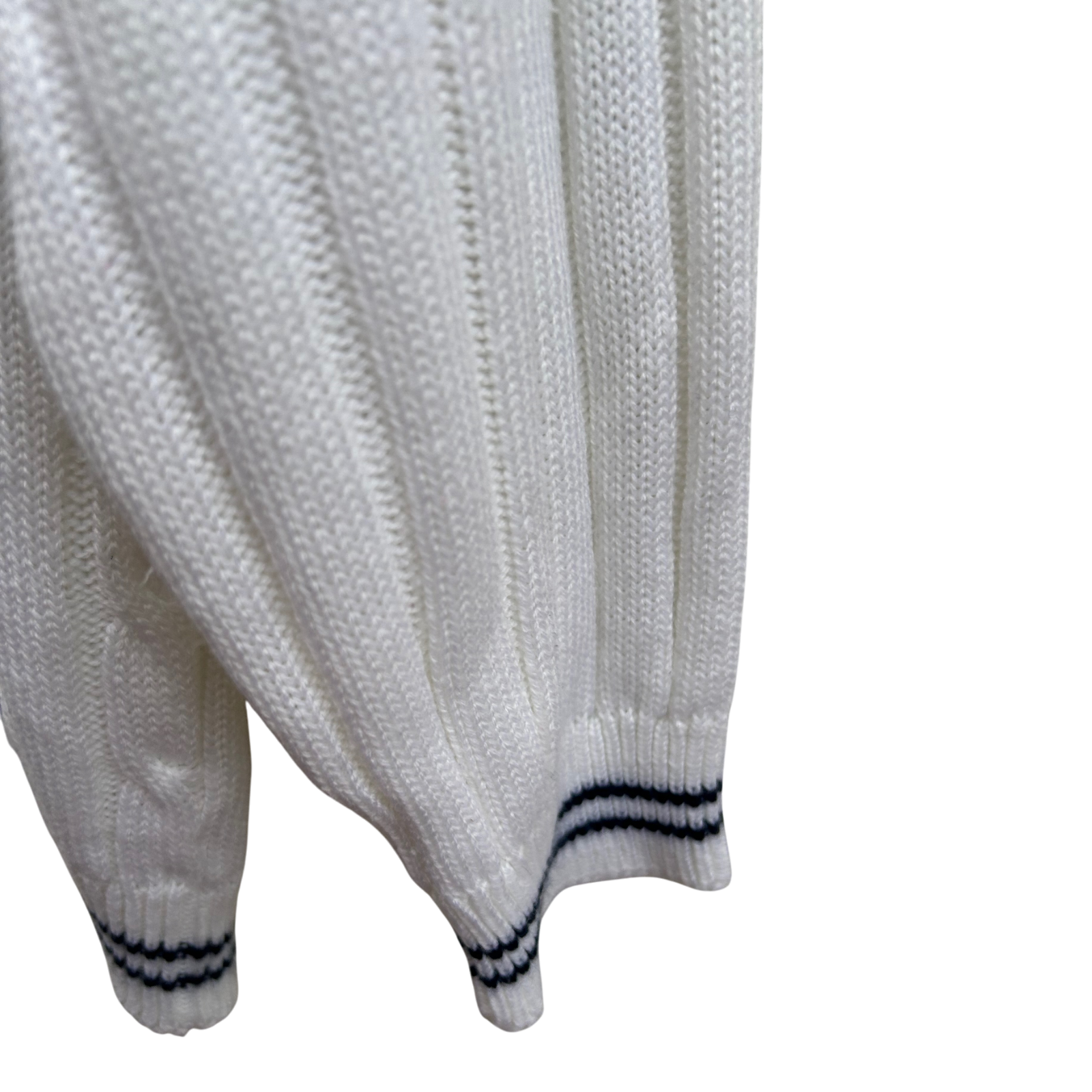 Klassischer Strickpullover von MaHel – Qualität & Mode – in Weiß mit feinem Zopfmuster und maritimen Kontraststreifen in Marineblau. Der Pullover hat eine angenehme Struktur, ist leicht dehnbar und insgesamt etwas kürzer geschnitten – sowohl in der Gesamtlänge als auch an den Ärmeln. Ideal für einen sportlich-eleganten Freizeitlook.