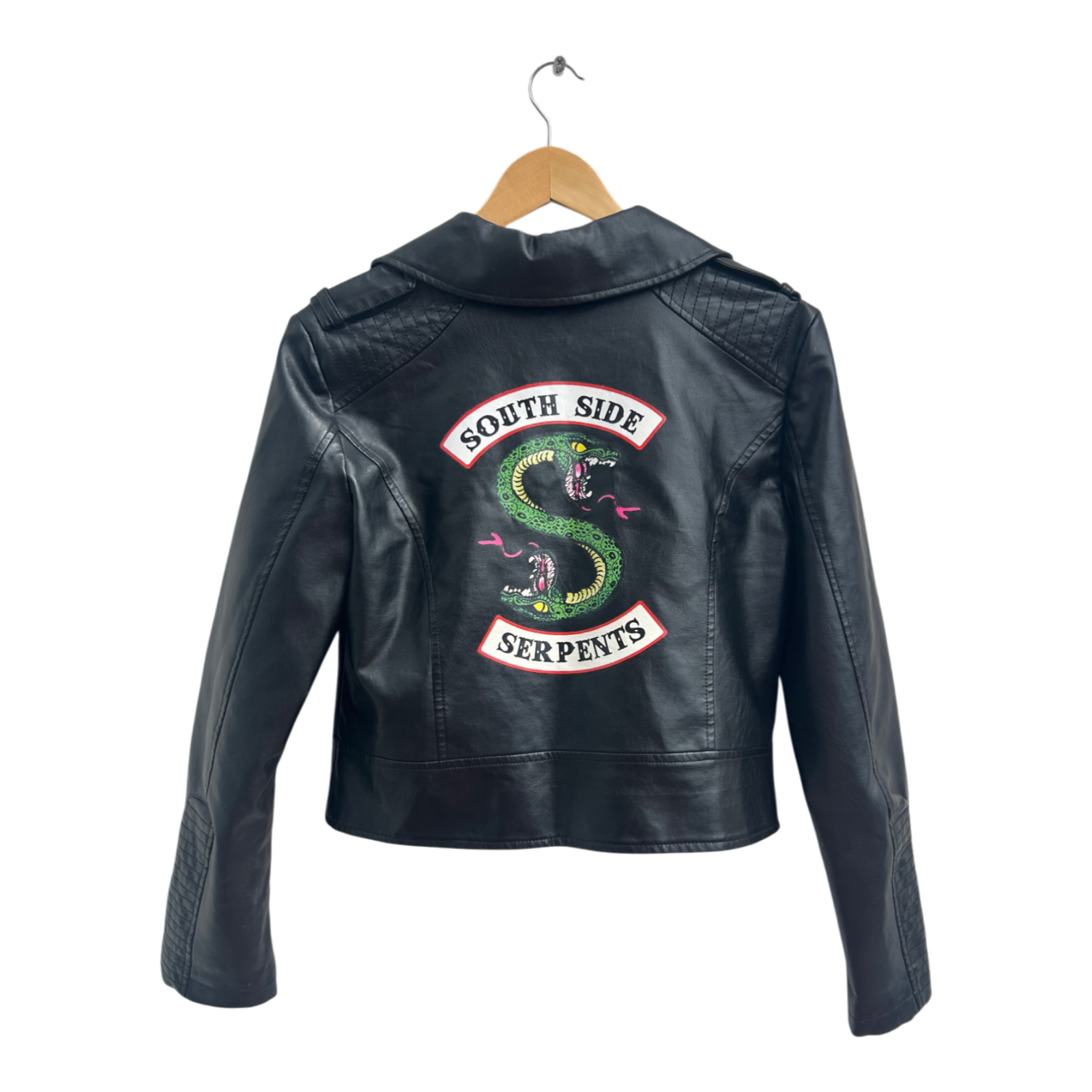 Stylische Kunstlederjacke in Schwarz – Größe L, mit rockigem Flair und urbanem Stil 😎 Die Jacke überzeugt durch glänzende Optik, Reißverschluss, Taschen und Zierdetails. Angenehm zu tragen, ideal für Freizeit, Festival oder Streetstyle. Leichte Gebrauchsspuren, aber insgesamt sehr guter Zustand ✨ Maße: Brustweite ca. 46 cm, Länge ca. 48 cm, Ärmel ca. 60 cm.