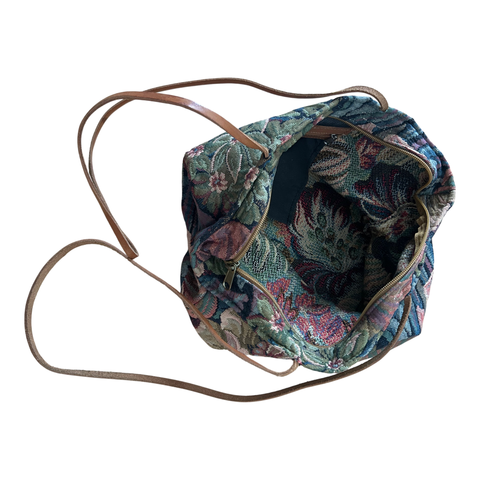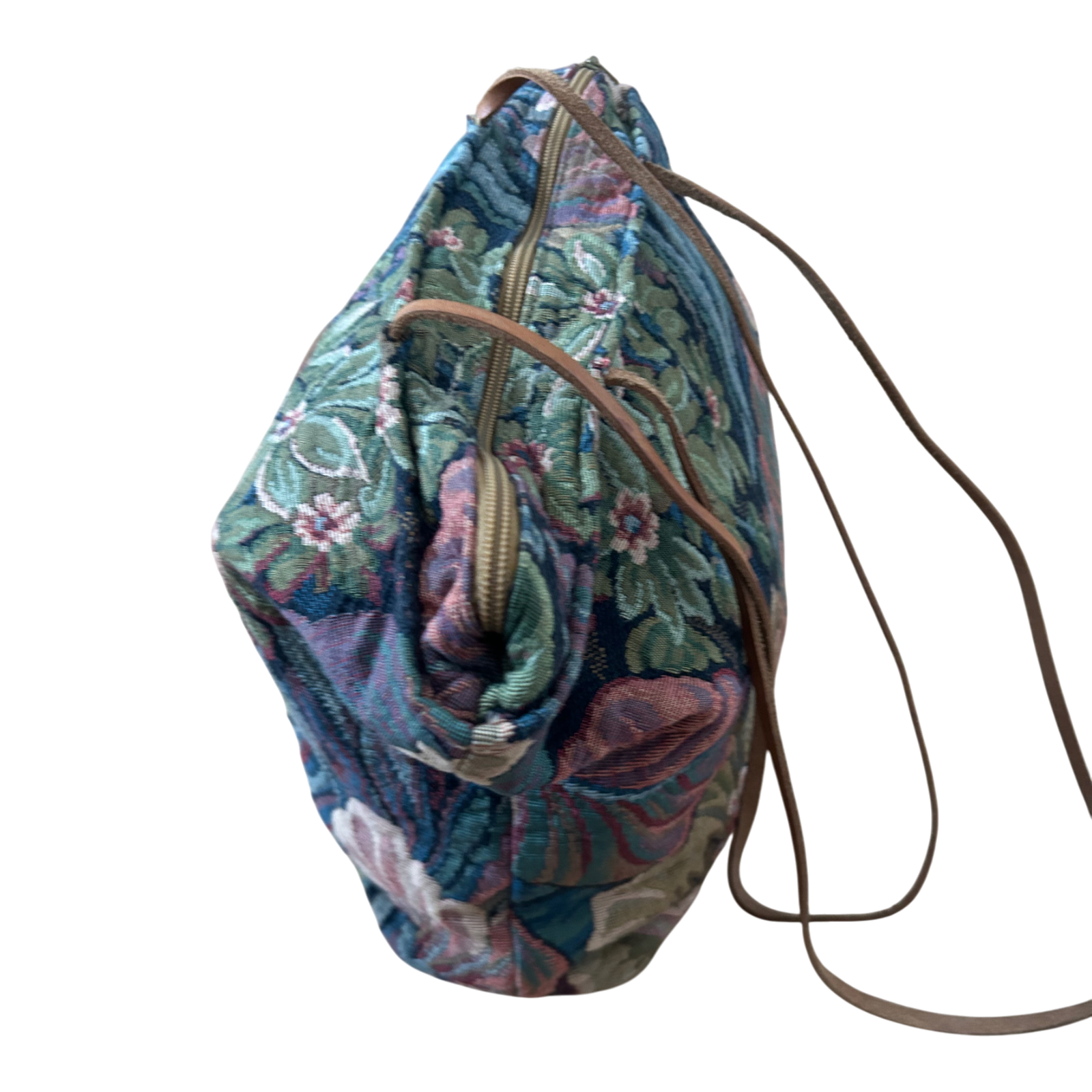 Diese wunderschöne Rula-Tasche im klassischen Gobelin-Design besticht durch ihr detailreiches Blumenmuster in Blau-, Grün- und Rosétönen. Der dichte Jacquardstoff sorgt für Stabilität, während die Echtleder-Henkel (ca. 84 cm) bequemes Tragen über der Schulter ermöglichen.