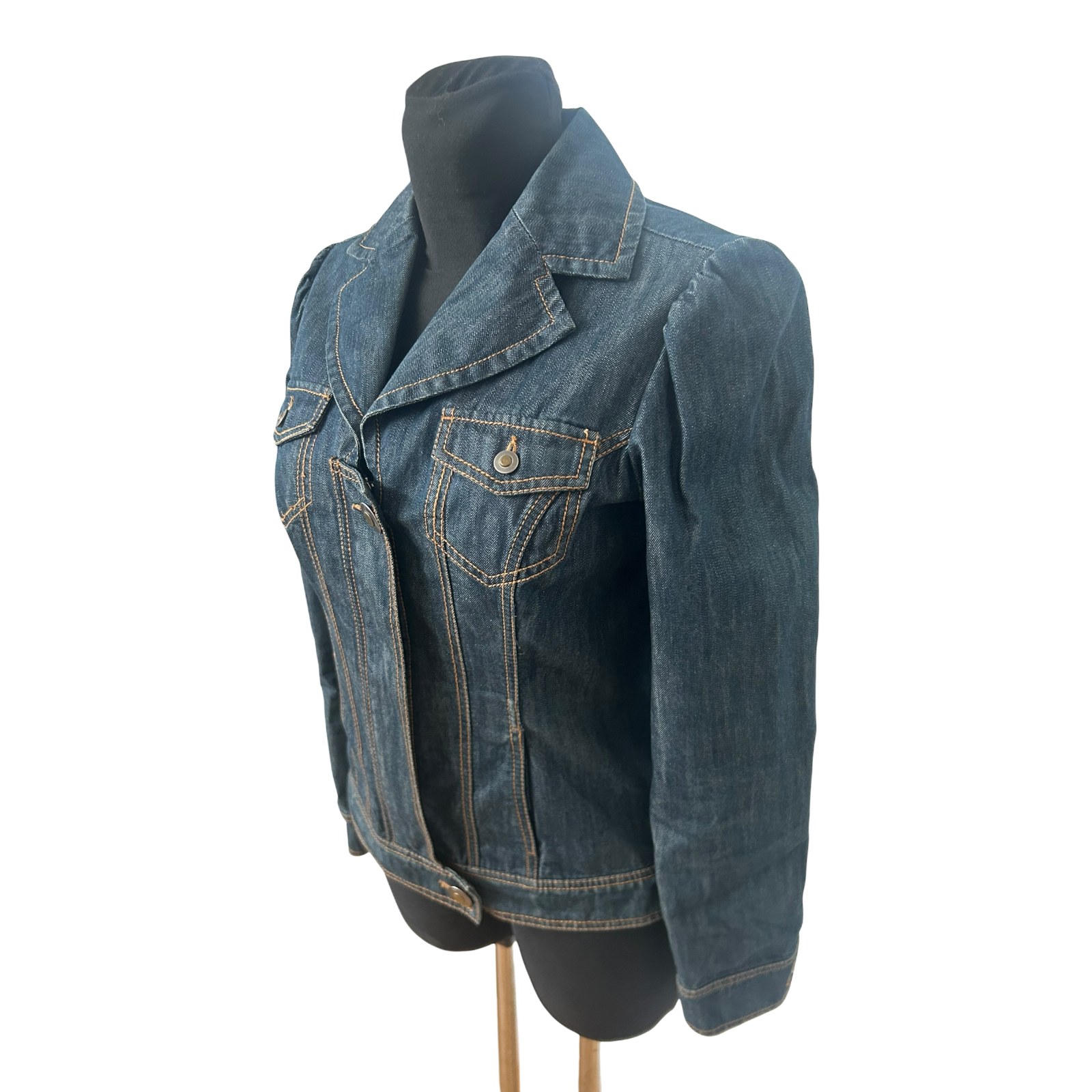 Diese taillierte Jeansjacke in Größe S überzeugt durch ihren femininen Schnitt und die klassische blaue Denimoptik. Der blazertypische Reverskragen verleiht dem Modell eine elegante Note, während Kontrastnähte und aufgesetzte Brusttaschen den typischen Jeanslook unterstreichen.