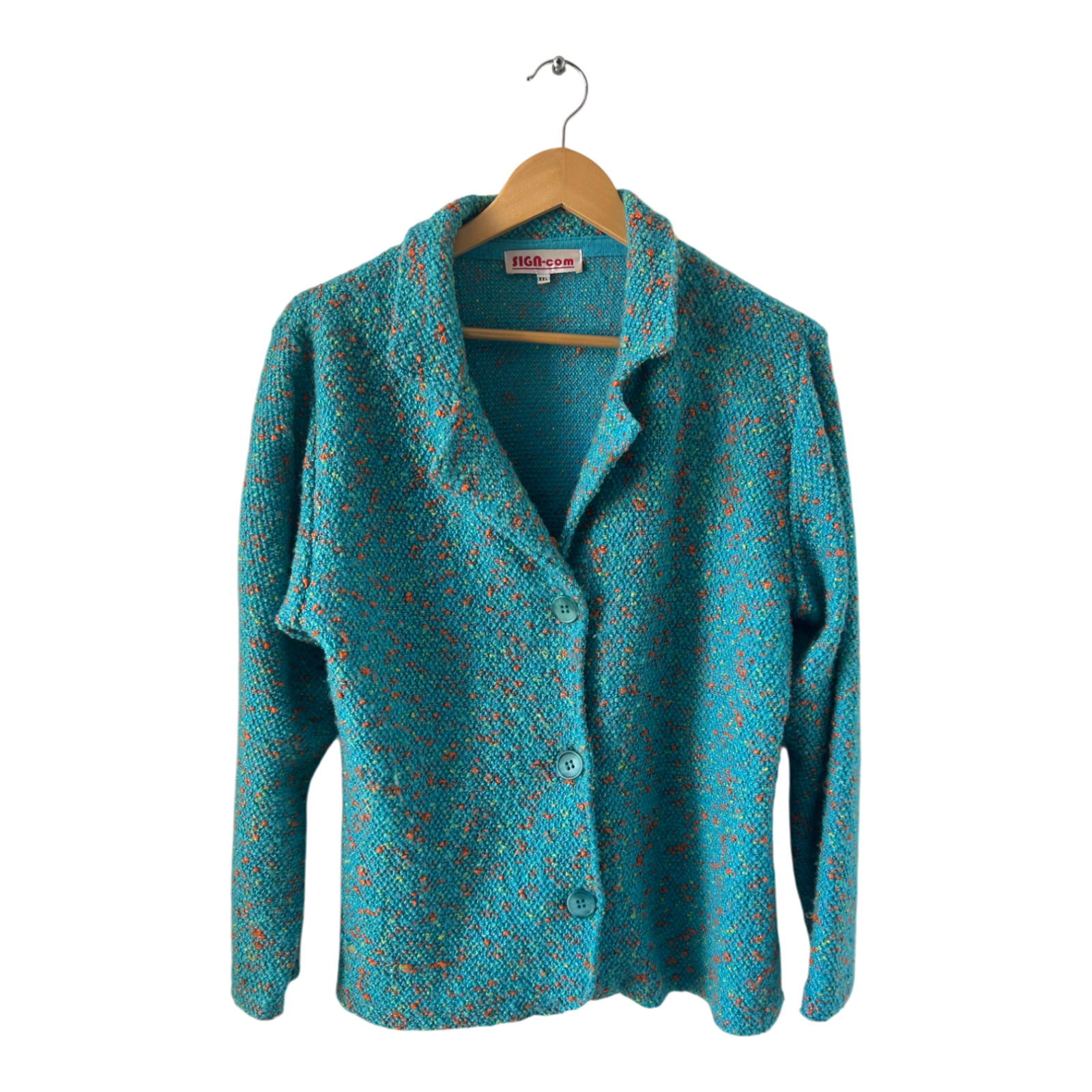 Farbenfrohe Damenjacke von SIGN-com in Größe XXL. Das strukturierte Material in Türkis mit bunten Farbakzenten macht die Jacke zu einem echten Hingucker. Sie ist ungefüttert und dadurch angenehm leicht, perfekt für die Übergangszeit oder als Statement-Piece im Alltag.