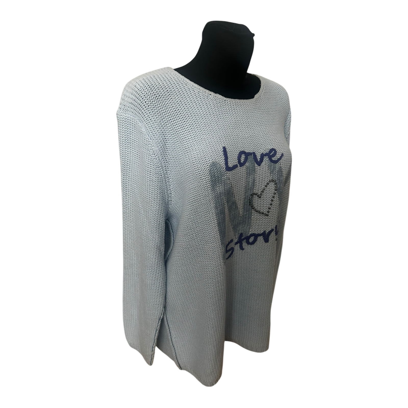 Six o Seven Pullover Damen Hellblau Oversize Langarm Grobstrick Love Print