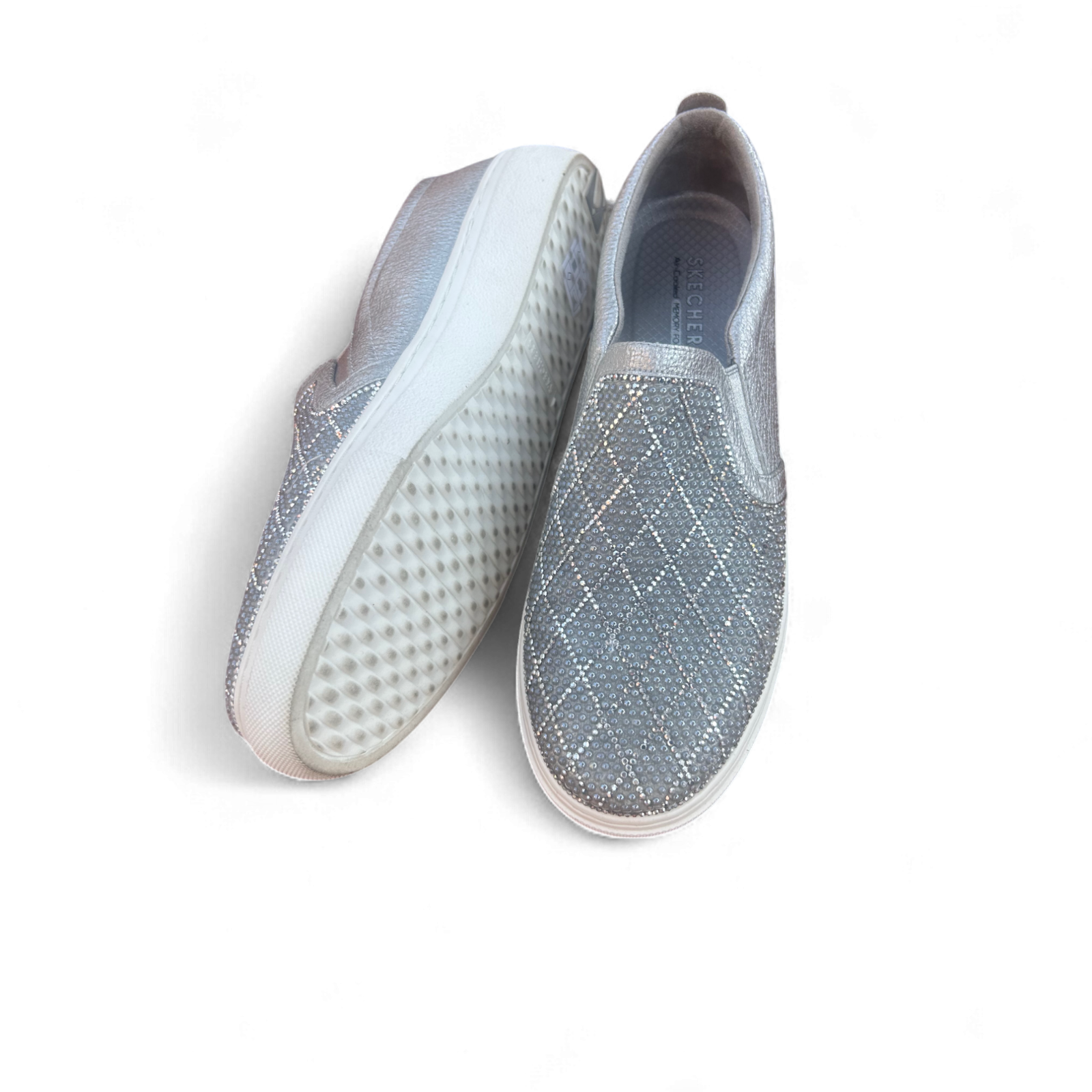 Wunderschöne Slip-On Sneaker von Skechers in Größe 38 💎 Das silberfarbene Obermaterial ist mit glitzernden Strassdetails verziert und verleiht den Schuhen einen eleganten, aber sportlichen Look. Dank Memory Foam Innensohle bieten sie maximalen Tragekomfort – ideal für Alltag, Freizeit oder besondere Anlässe! Die Schuhe wurden nur 1–2 Mal getragen und sind daher in einem fast neuwertigen Zustand ✨