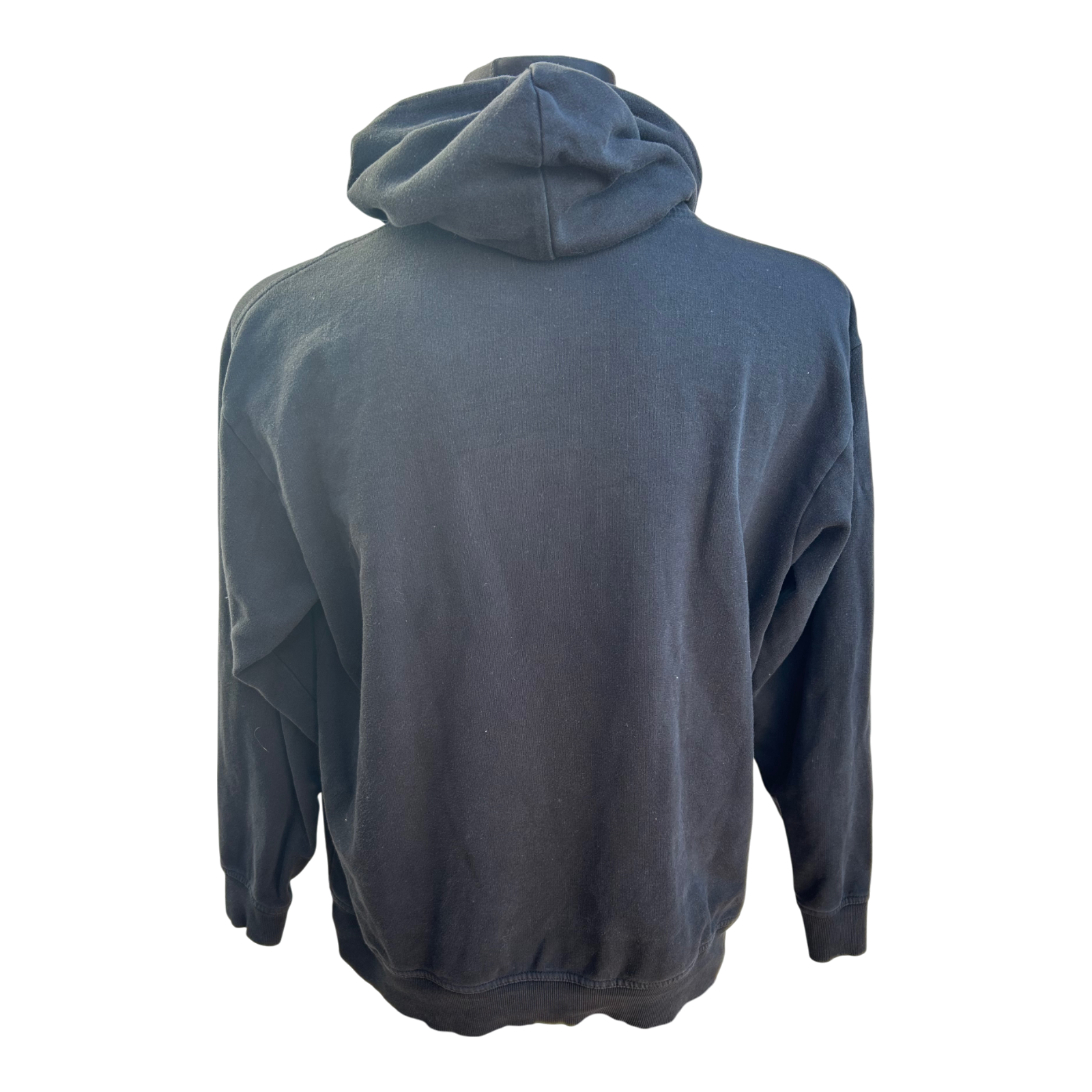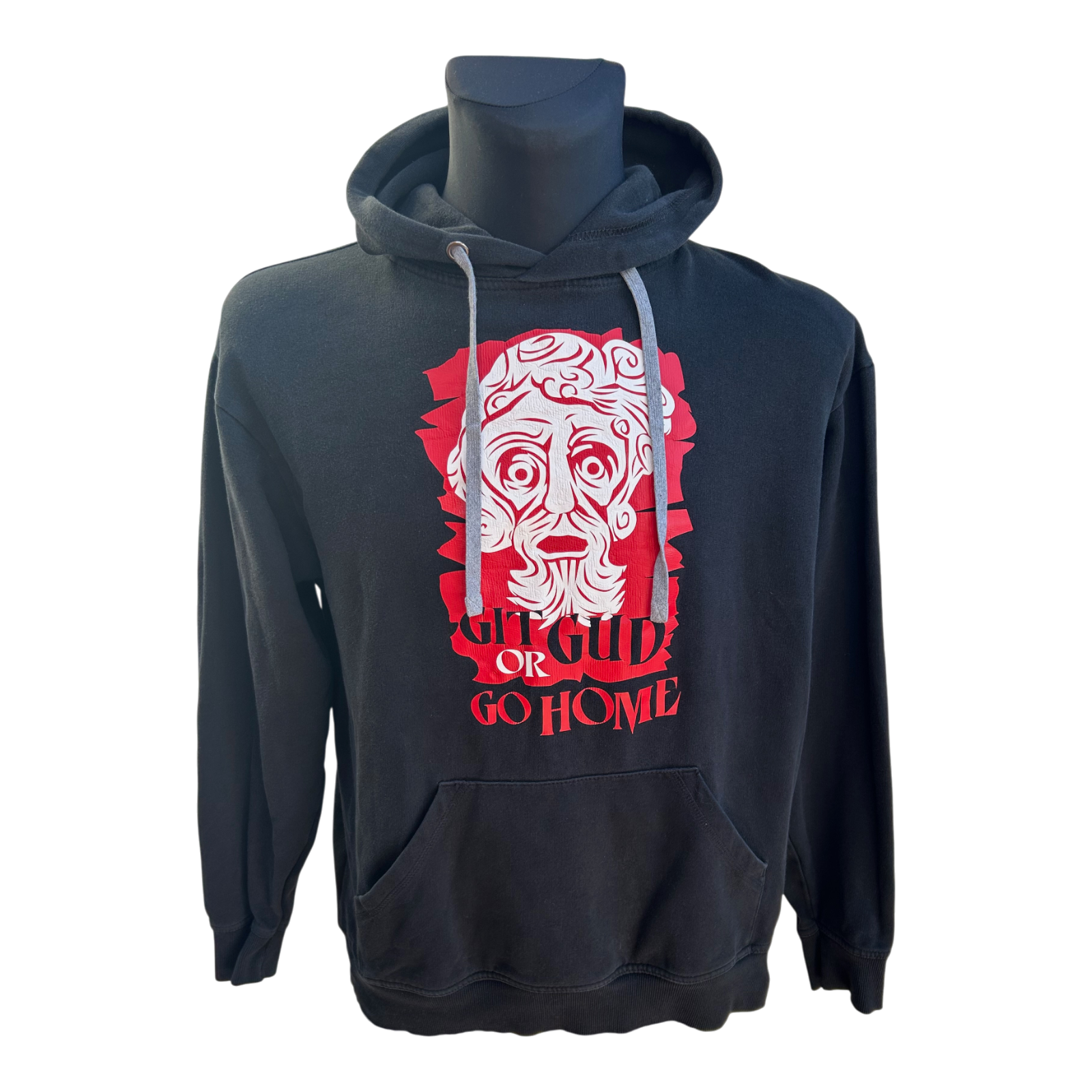 Schwarzer Hoodie von Spread mit auffälligem roten Frontprint „Git Gud or Go Home“ 🎮. Der Pullover besteht aus 80 % Baumwolle und 20 % Polyester, ist innen weich angeraut und angenehm zu tragen. Die Kapuze ist doppellagig und mit Kordelzug versehen, die klassische Kängurutasche bietet zusätzlichen Komfort 🧥. Brustweite 57 cm, Länge 66 cm, Ärmellänge 60 cm. Der Hoodie befindet sich in sehr gutem Zustand und passt perfekt zu Gaming-Fans oder urbanen Freizeitlooks.