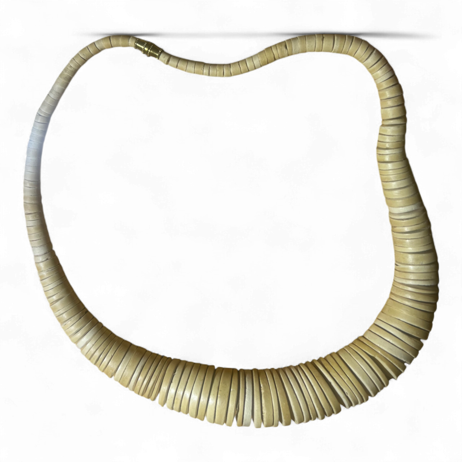 Diese auffällige Statementkette aus naturfarbenem Holz besticht durch ihre massive, plastische Form und den soften Cremeton. Sie misst ca. 50 cm in der Länge und wird mit einem stabilen Schraubverschluss geschlossen. Trotz ihrer Präsenz ist sie angenehm leicht zu tragen – ideal für alle, die das Besondere suchen 🌿✨