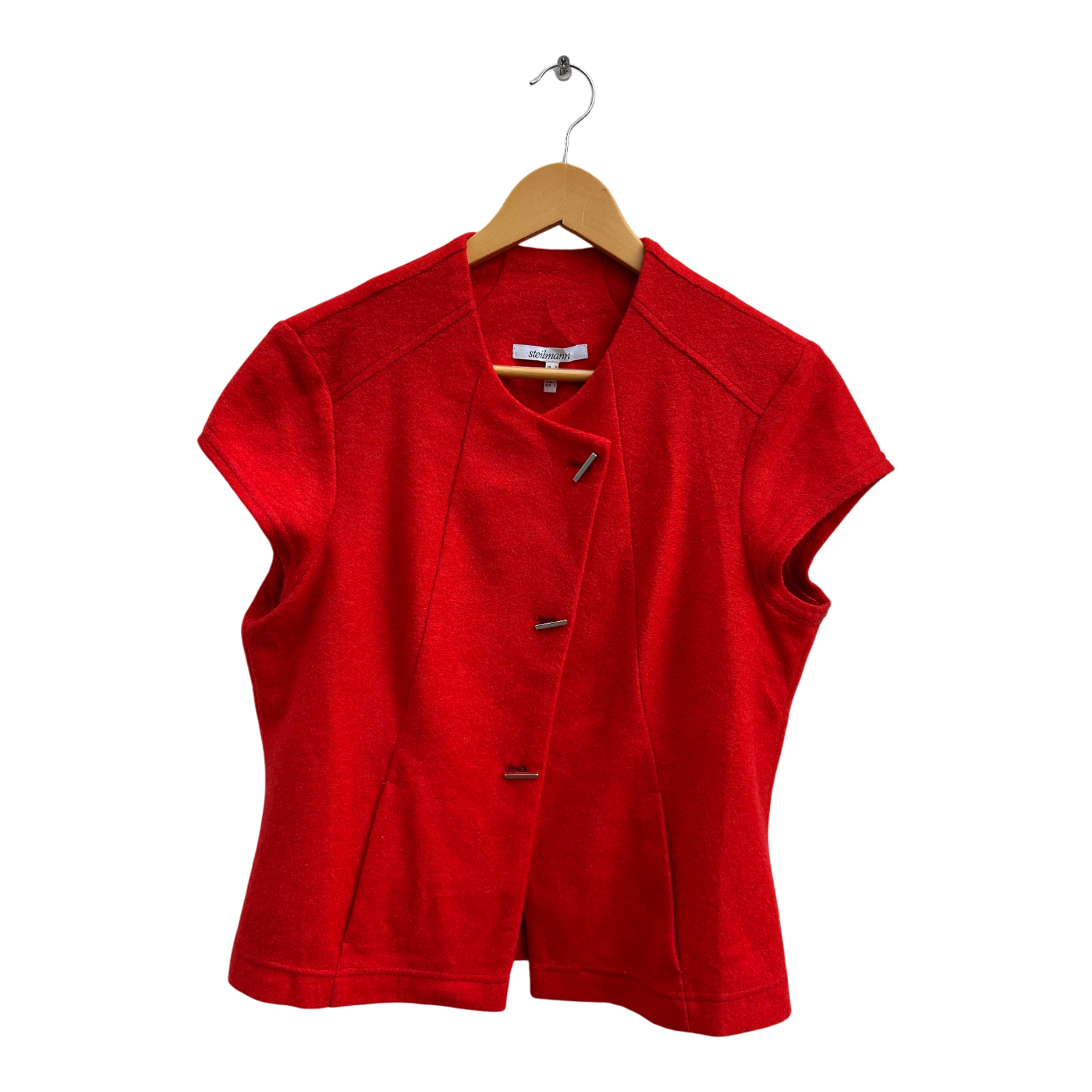 Elegante Weste von Steilmann in einem leuchtenden Orangerot – ein echter Blickfang für Büro, Freizeit oder Übergang. Das Modell hat kurze Ärmel, zwei Taschen vorne und eine dekorative, asymmetrische Knopfleiste. Das Materialetikett fehlt, die Zusammensetzung wurde nach bestem Wissen anhand von Griff und Optik eingeordnet (Wollmischung). Größe 38, Brustweite ca. 49 cm, Länge ca. 55 cm. Sehr guter Zustand.