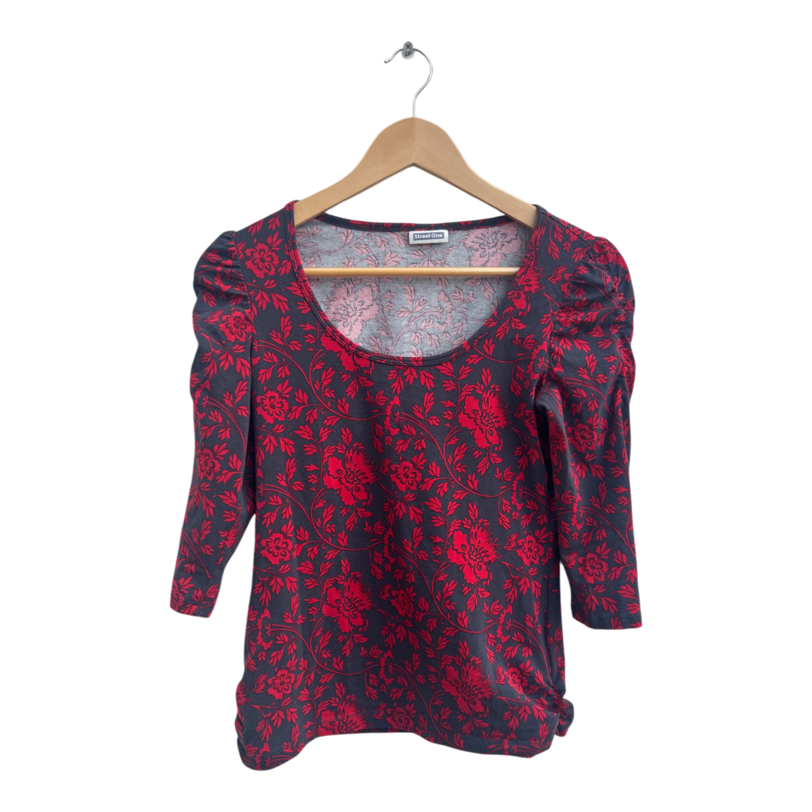 Schönes Damen Shirt von Street One in Größe 36. Das Oberteil ist in einem auffälligen Rot-Schwarz gehalten und zeigt ein dekoratives Blumenmuster. Mit einer Brustweite von ca. 40 cm und einer Länge von ca. 56 cm sitzt es figurbetont und dank des Stretch-Anteils sehr bequem. Gefertigt aus 95 % Baumwolle und 5 % Elasthan trägt es sich angenehm auf der Haut und bietet optimale Bewegungsfreiheit. Der Rundhalsausschnitt und die 3/4-Ärmel machen es vielseitig kombinierbar – perfekt für Freizeit, Büro oder einen besonderen Anlass. 🌹 Ein feminines Street One Stück, das mit seiner Qualität und dem Design überzeugt.