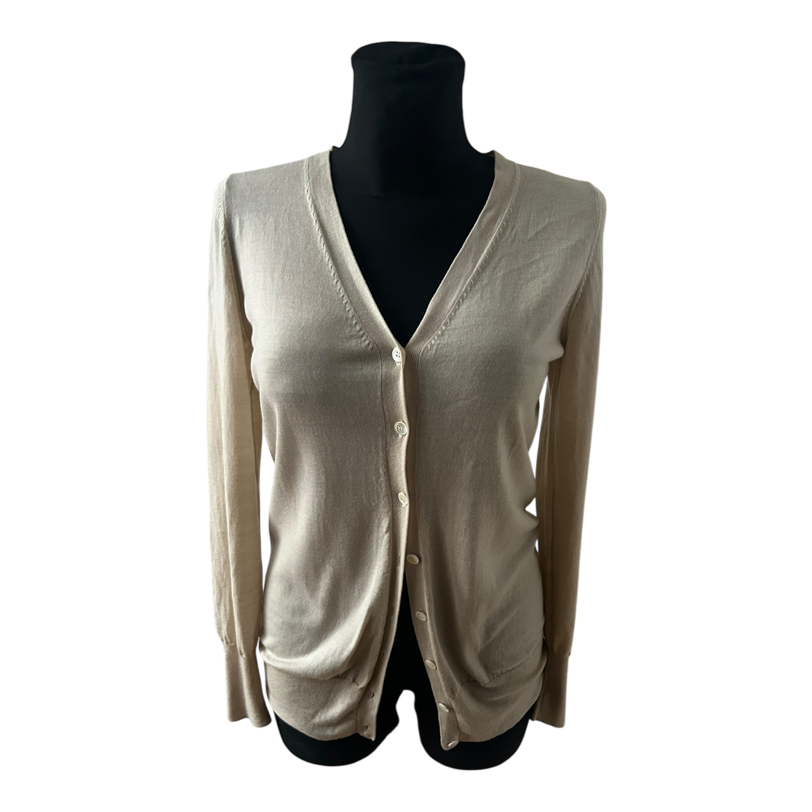Sehr edle Strickjacke der Marke Strenesse in einem zeitlosen, hellen Beigeton. Der Cardigan ist in Größe 40 ausgezeichnet und überzeugt durch seine klare Linienführung, den femininen V-Ausschnitt und die feine Knopfleiste. Das Modell wirkt pur, hochwertig und äußerst stilvoll – ein echtes Klassikerstück für eine anspruchsvolle Garderobe ✨🤍