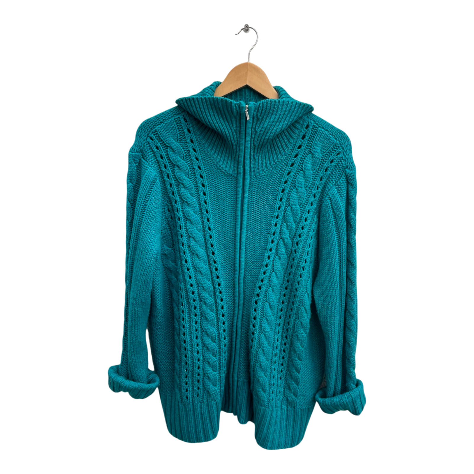 Strickjacke Damen Gr 46 Petrol Zopfmuster Langarm Reißverschluss Cardigan Pullover