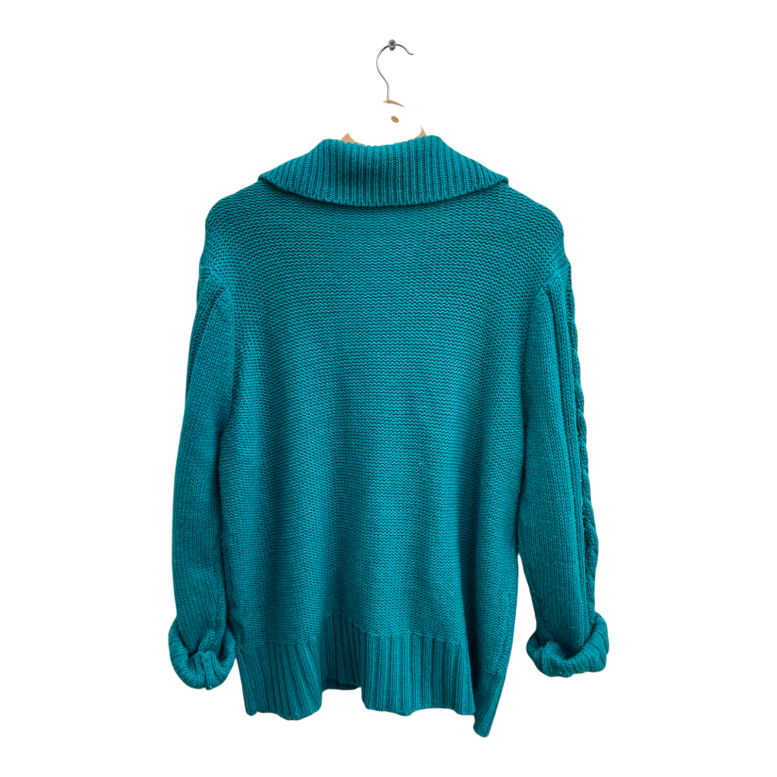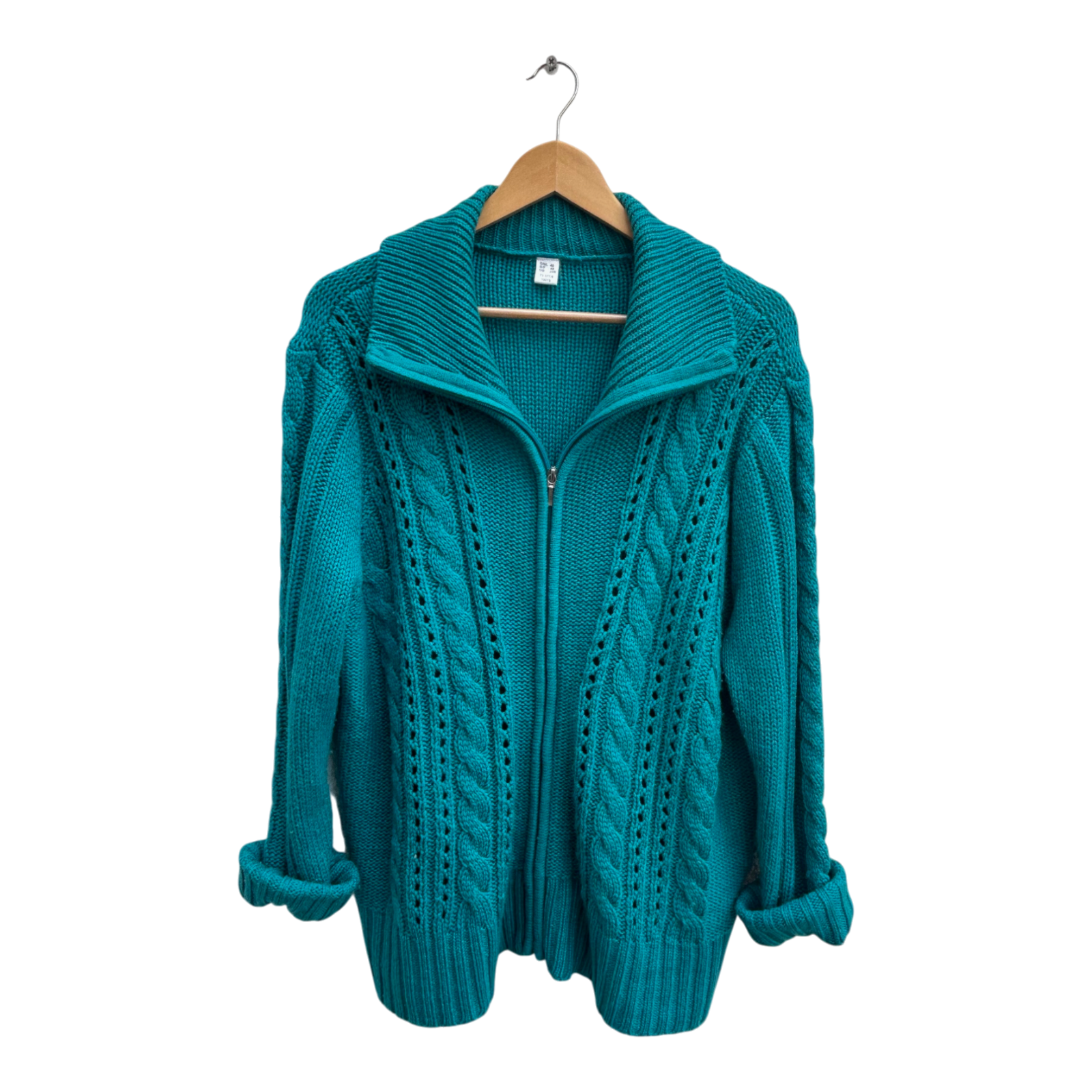 Diese Strickjacke in edlem Petrol sorgt für gemütlichen Tragekomfort und stilvolles Auftreten ❄️. Sie besteht aus 100 % Polyester und hat die Maße: Brustweite ca. 60 cm, Länge ca. 68 cm und Armlänge ca. 66 cm. Durch den praktischen Reißverschluss, den hohen Kragen und das klassische Zopfmuster wird sie zu einem vielseitigen Kleidungsstück, das sowohl im Alltag als auch in der Freizeit getragen werden kann ✨. Ein wärmendes Lieblingsteil für die kühleren Tage.