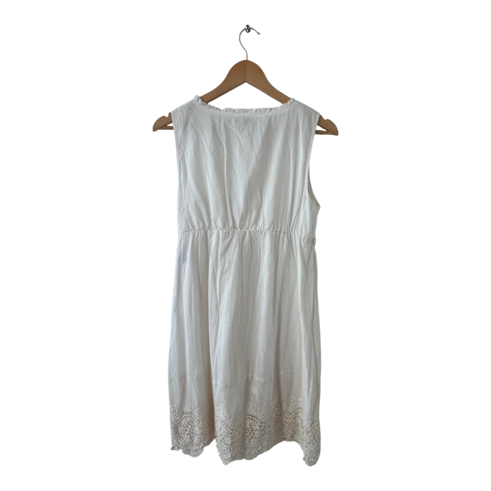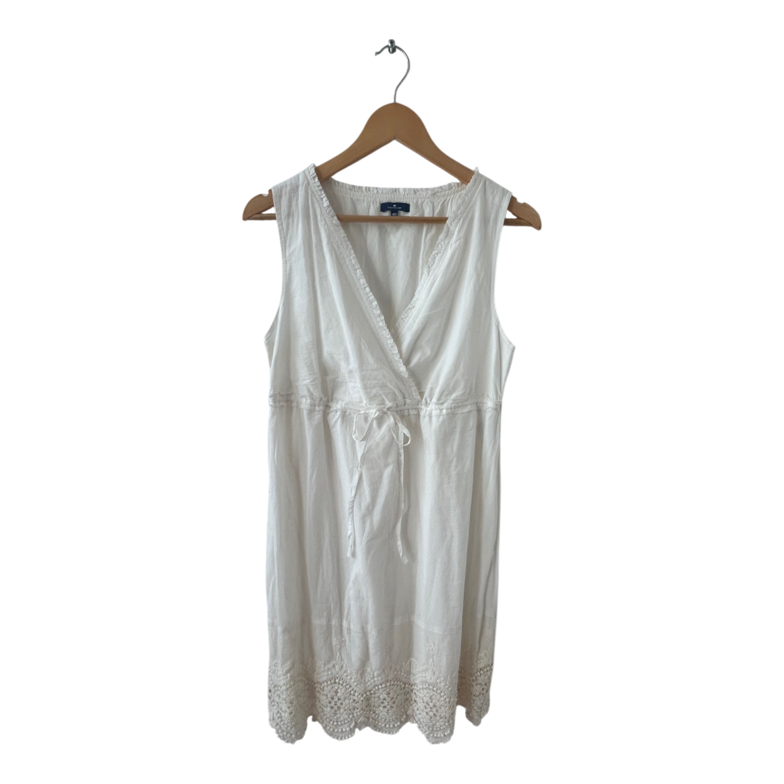 🤍 Sommerkleid von Tom Tailor in edlem Wollweiß. Das ärmellose Design überzeugt mit femininer Wickeloptik und feiner Spitzenborte am Saum. In der Taille sorgt ein integriertes Bindeband für eine individuell regulierbare Passform. Das Kleid ist komplett gefüttert und angenehm leicht zu tragen – ideal für warme Tage. Brustweite ca. 50 cm, Gesamtlänge ca. 90 cm.