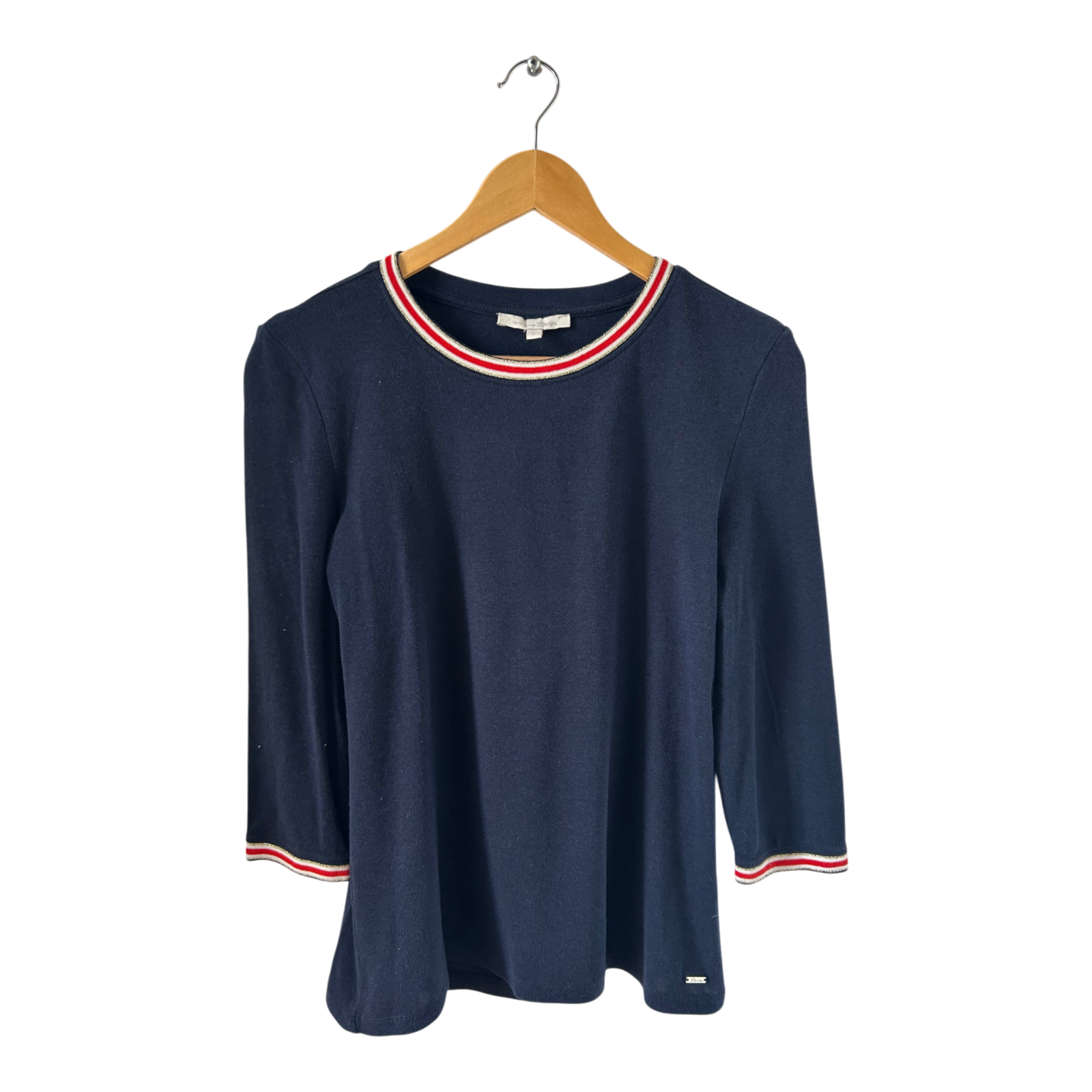 Klassisches dunkelblaues Shirt von Tom Tailor in Größe L. Der weiche Baumwollstoff sorgt für angenehmen Tragekomfort, während die 3/4-Ärmel und die kontrastierenden Streifen in Rot, Weiß und Silber an Kragen und Ärmelabschlüssen dem Shirt einen sportlich-eleganten Look verleihen. Ideal für Freizeit oder Büro. Brustweite ca. 44 cm, Länge ca. 62 cm. Sehr guter Zustand ✨