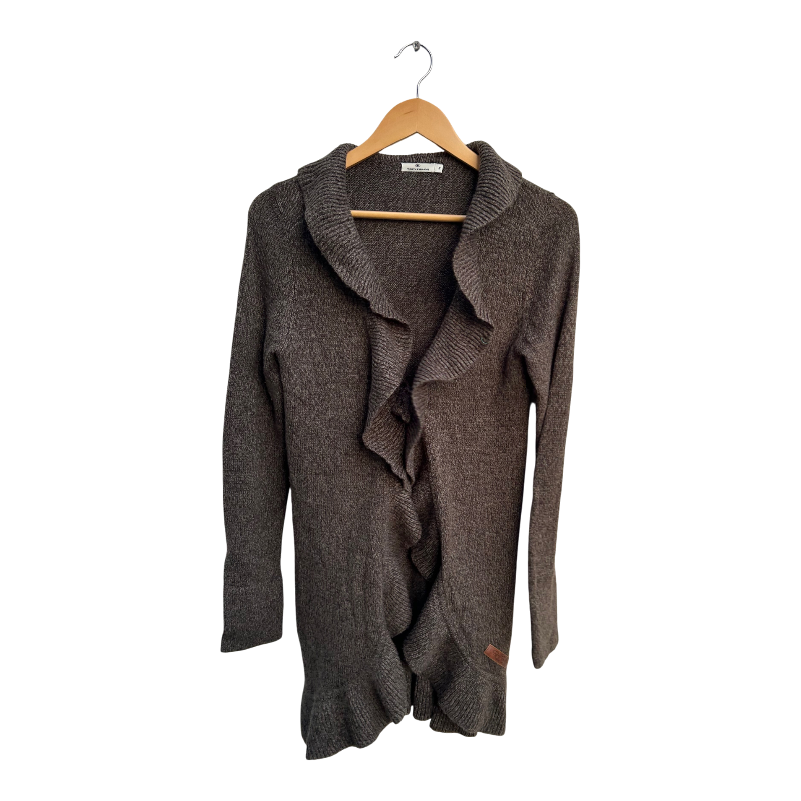 Tom Tailor Strickjacke Damen M Grau Rüschen Lang Feinstrick Bindegürtel Elegant