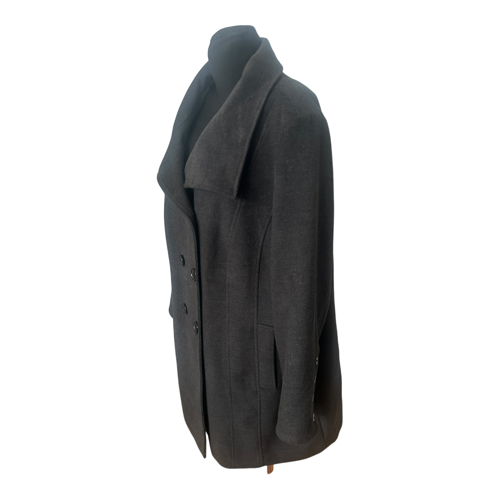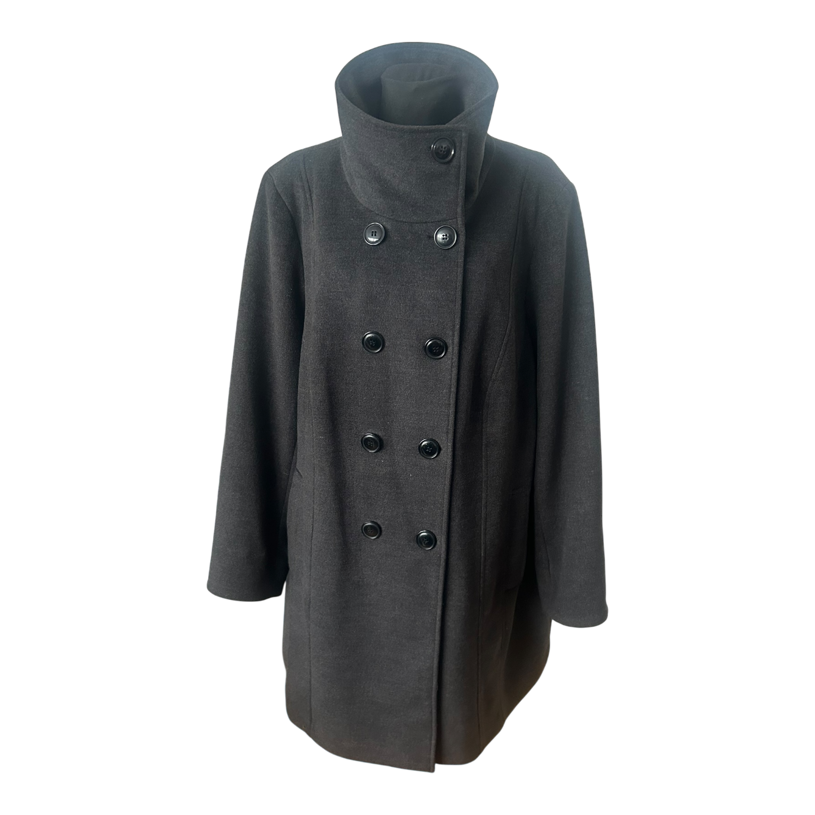 Eleganter Mantel von Ulla Popken in Größe 50 in edlem Anthrazit mit doppelreihiger Knopfleiste und schönem, hohem Kragen – wirkt sofort angezogen und hochwertig ✨ Der Oberstoff besteht aus 82% Polyester, 15% Viskose und 3% Elasthan, das Innenfutter aus 100% Polyester. Maße: Brustweite ca. 69 cm, Länge ca. 98 cm, Ärmellänge ca. 68 cm. Pflegehinweis: Reinigung empfohlen 🖤