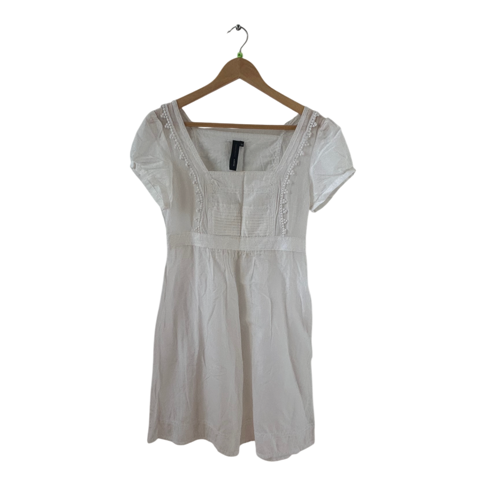 Zartes Sommerkleid von Vero Moda in reinem Weiß mit dekorativer Spitze und zarter Transparenz 🌼. Femininer Empire-Schnitt mit kurzen Puffärmeln, quadratischem Ausschnitt und seitlichem Reißverschluss. Ideal für warme Tage oder Festival-Looks. Brustweite ca. 40 cm, entspricht Gr. 38. Ohne Innenetikett. Sehr guter Zustand.