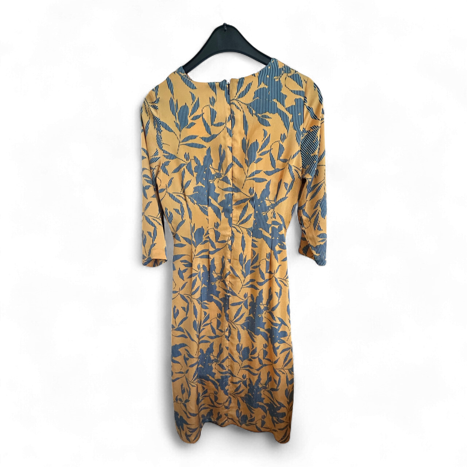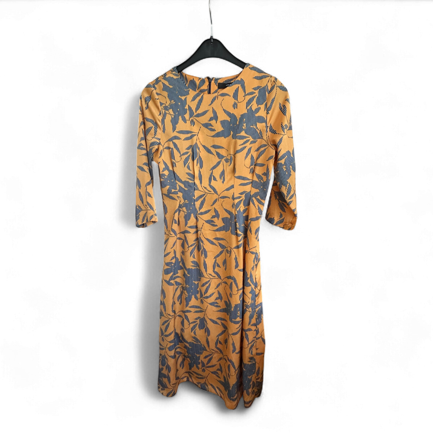 Stilvolles Midikleid von Vero Moda in kräftigem Orangegelb mit floralem Allover-Print in Schwarz 🌿. Mit Reißverschluss am Rücken, 3/4-Ärmeln und einem lockeren, leicht ausgestellten Schnitt. Ungefüttert, aber nicht durchsichtig. Brustweite ca. 50 cm, Länge ca. 116 cm. Größe M. Ohne Pflegeetikett, aber sehr guter Zustand.
