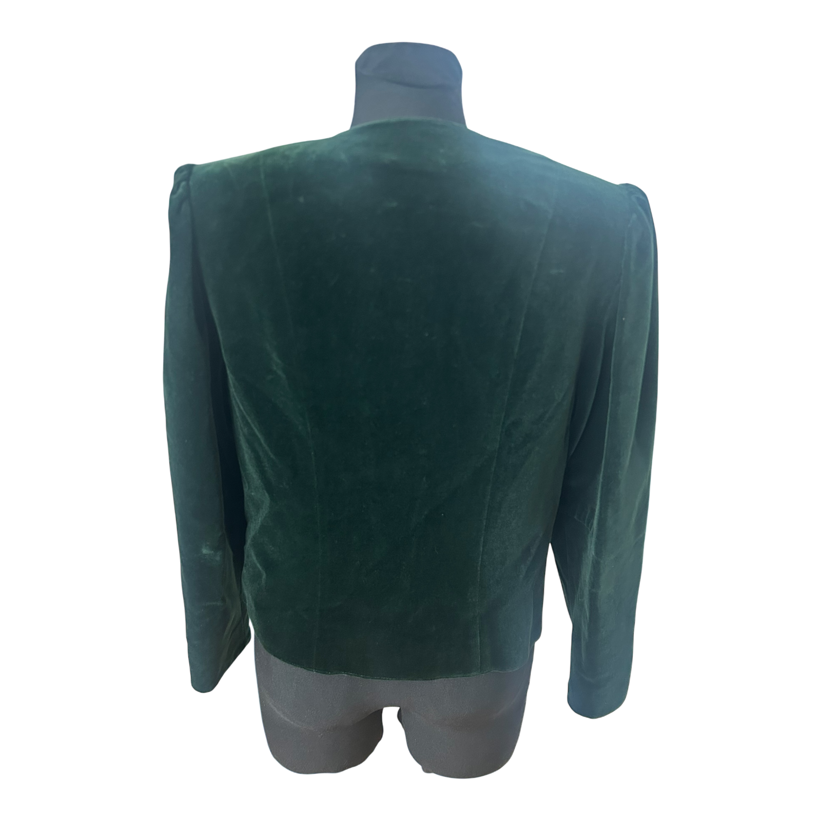 Dieser elegante Vintage-Blazer in Größe 38 begeistert durch seine edle Samtoptik in einem tiefen Dunkelgrün und stilvolle goldfarbene Knöpfe. Der klassische Reverskragen und der taillierte Schnitt verleihen dem Modell eine feminine, zeitlose Ausstrahlung.