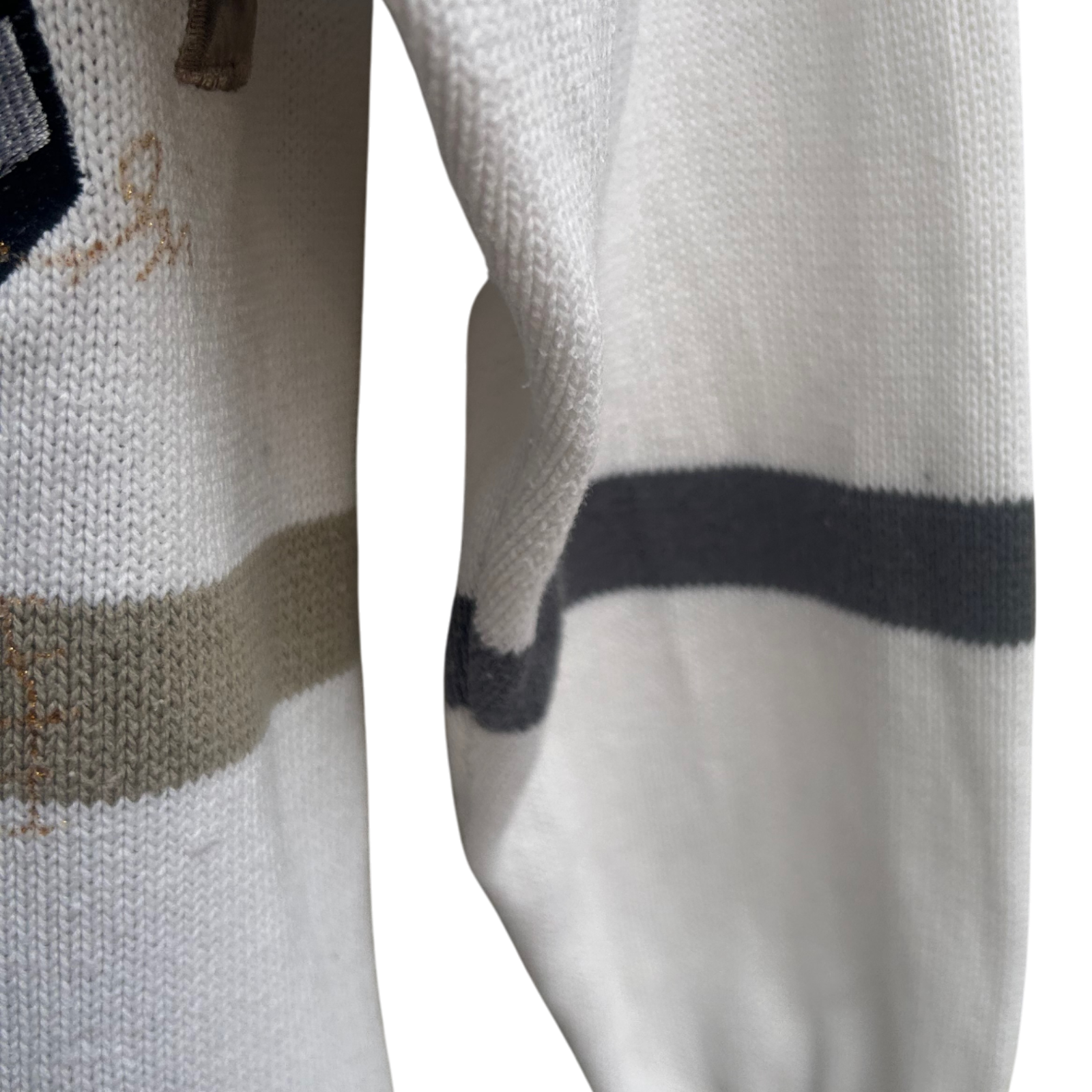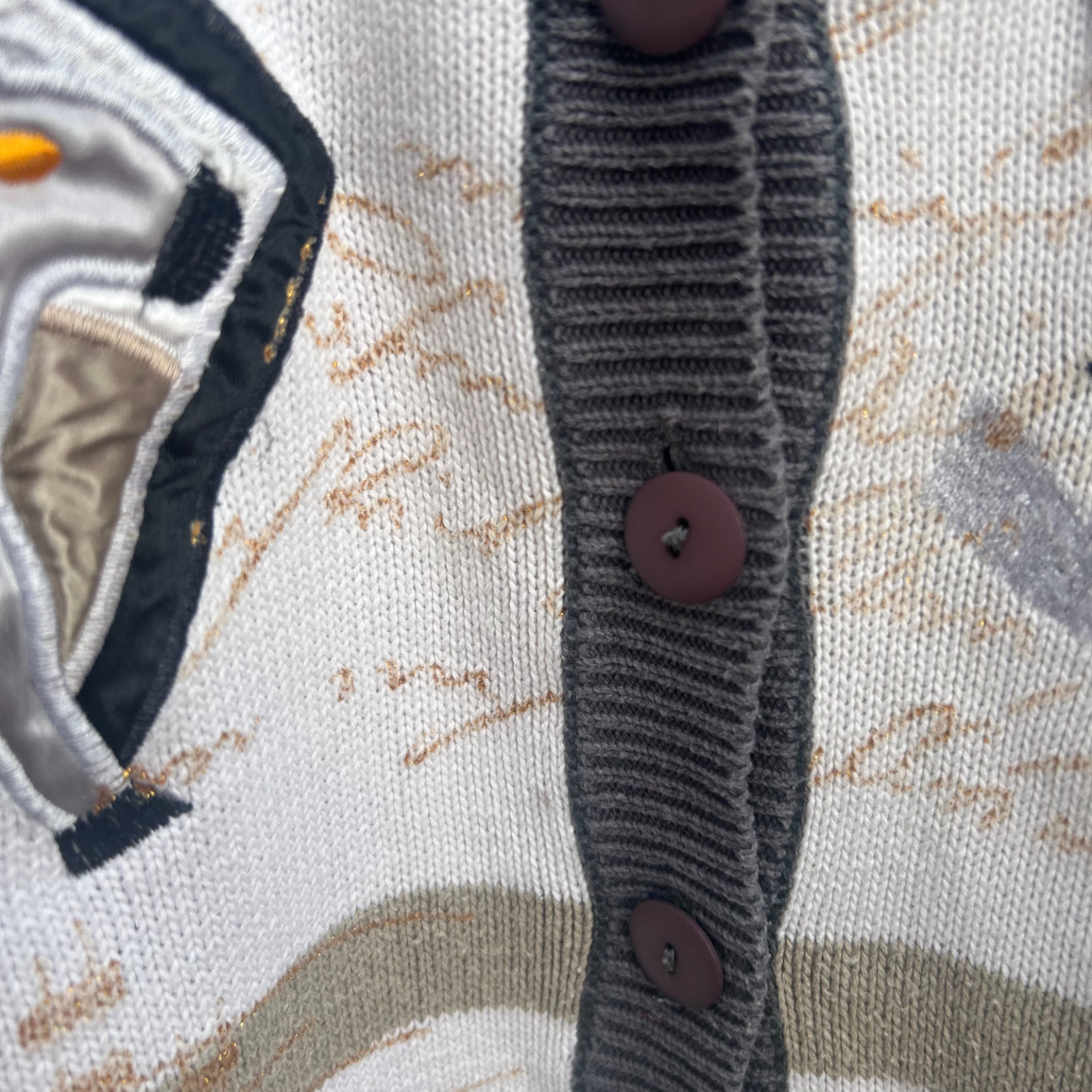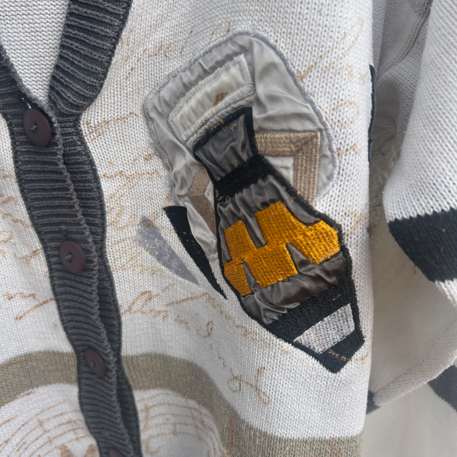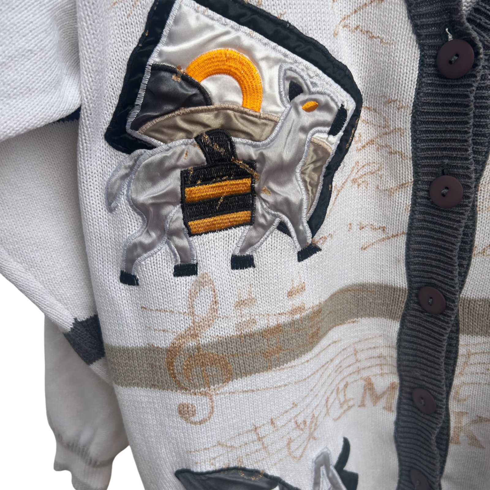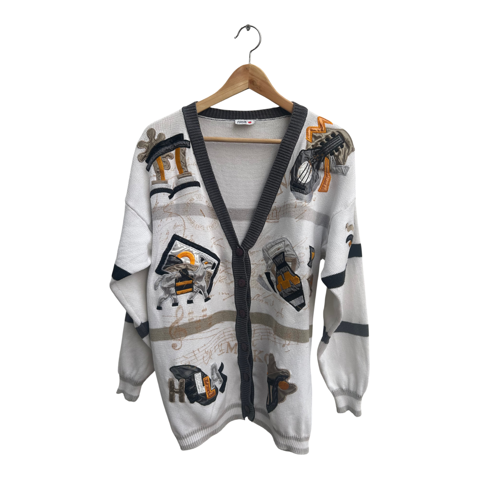 Diese ausgefallene Vintage Herren Strickjacke von Joy.E + Fun in Größe M verbindet markante Retro-Ästhetik mit hochwertigen Baumwollmaterialien und kunstvollen Applikationen 🎨.